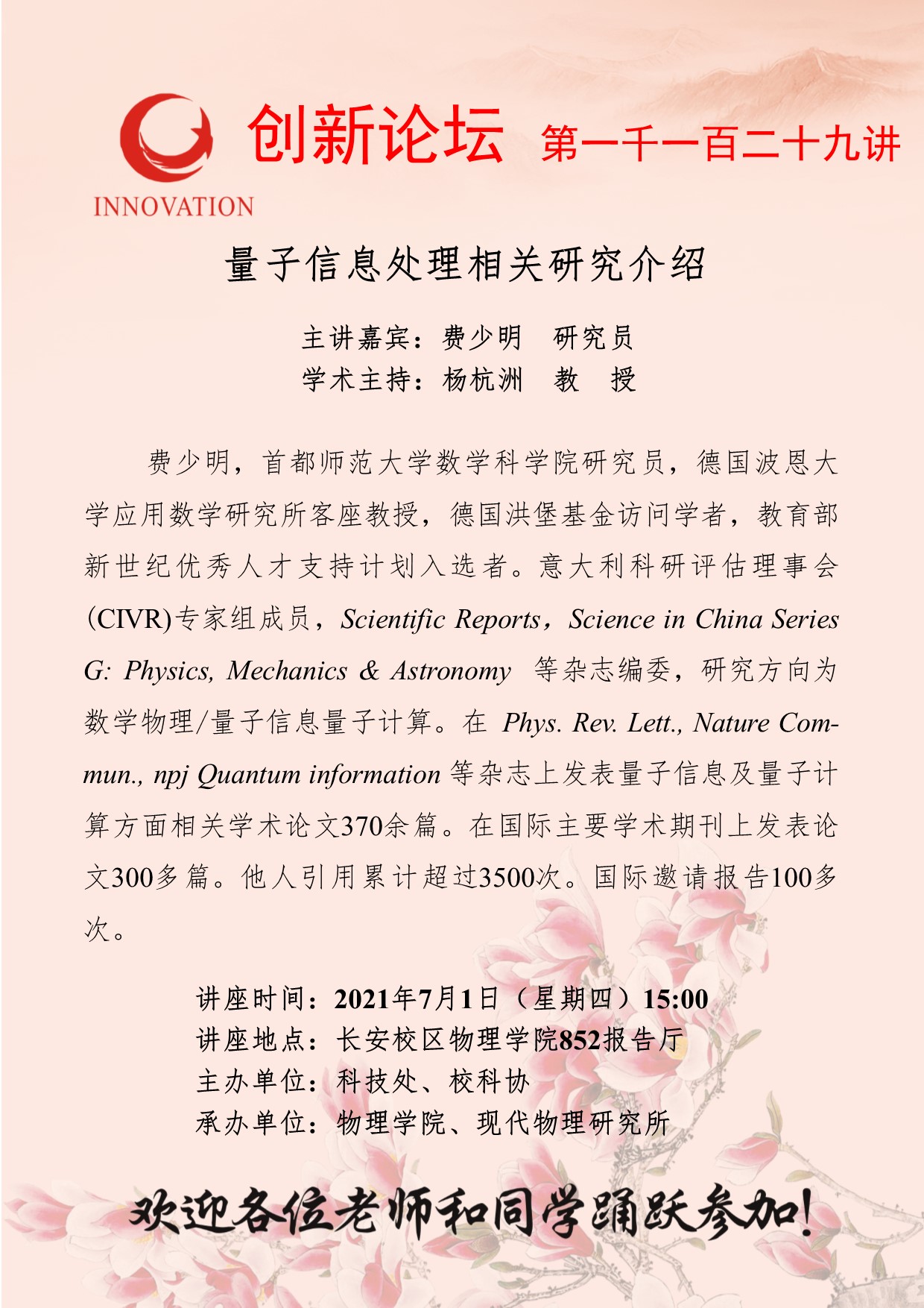费少明 研究员 开云手机网页版登录入口创新论坛第一千一百二十九讲:量子信息处理相关研究介绍 讲座时间 2021年7月1日(星期四)15:00 讲座地点 长安校区物理学院852报告厅 讲座人介绍 费少明 研究员 讲座内容