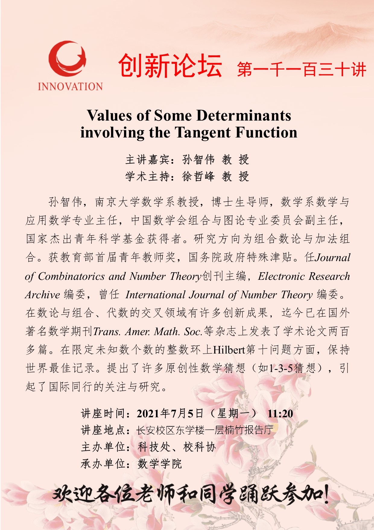 孙智伟 教 授 开云手机网页版登录入口创新论坛第一千一百三十讲:Values of Some Determinants involving the Tangent Function 讲座时间 2021年7月5日(星期一) 11:20 讲座地点 长安校区东学楼一层楠竹报告厅 讲座人介绍 孙智伟 教 授 讲座内容