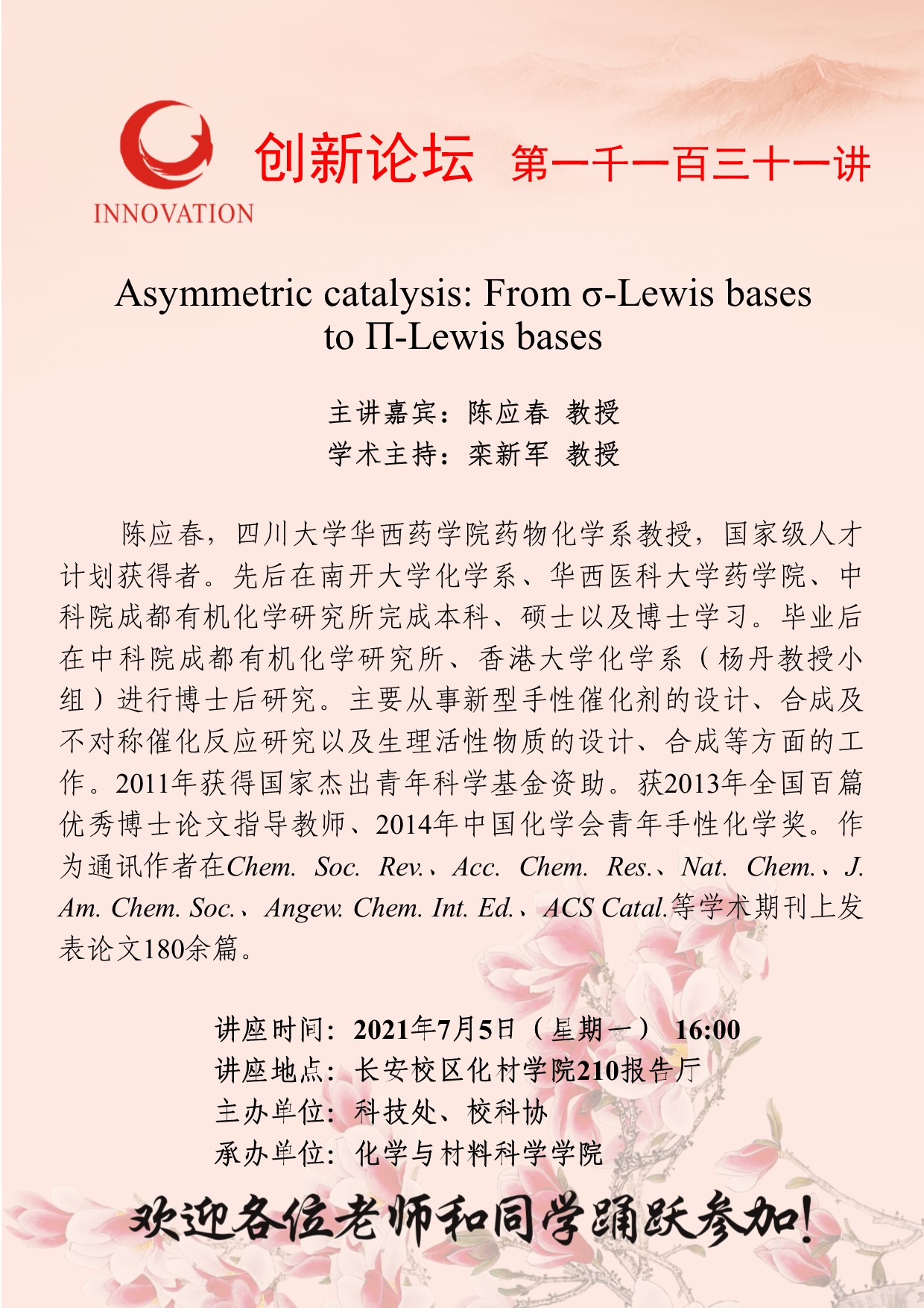 陈应春 教授 开云手机网页版登录入口创新论坛第一千一百三十一讲:Asymmetric catalysis: From σ-Lewis bases to Π-Lewis bases 讲座时间 2021年7月5日(星期一)16:00 讲座地点 长安校区化材学院210报告厅 讲座人介绍 陈应春 教授 讲座内容