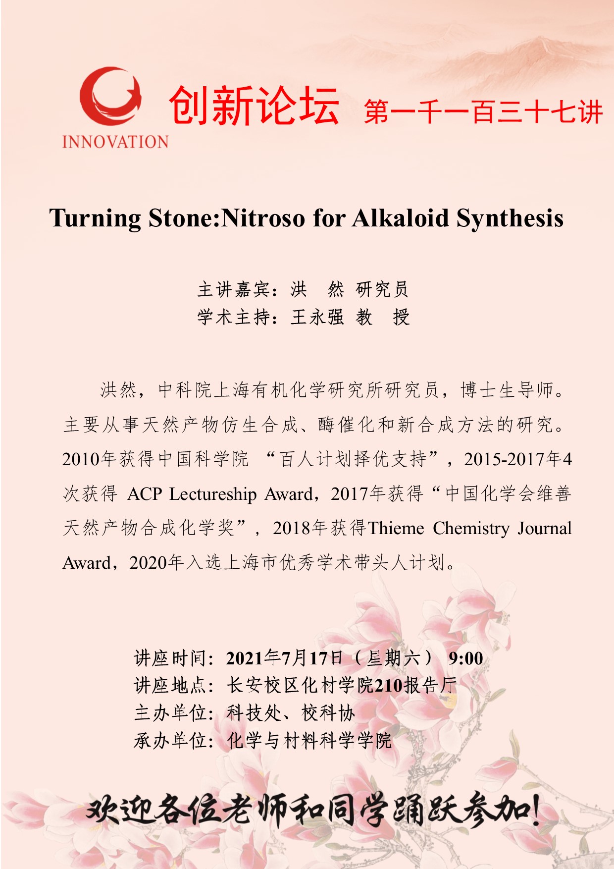 洪然 研究员 开云手机网页版登录入口创新论坛第一千一百三十七讲:Turning Stone:Nitroso for Alkaloid Synthesis 讲座时间 2021年7月17日(星期六) 9:00 讲座地点 长安校区化材学院210报告厅 讲座人介绍 洪然 研究员 讲座内容