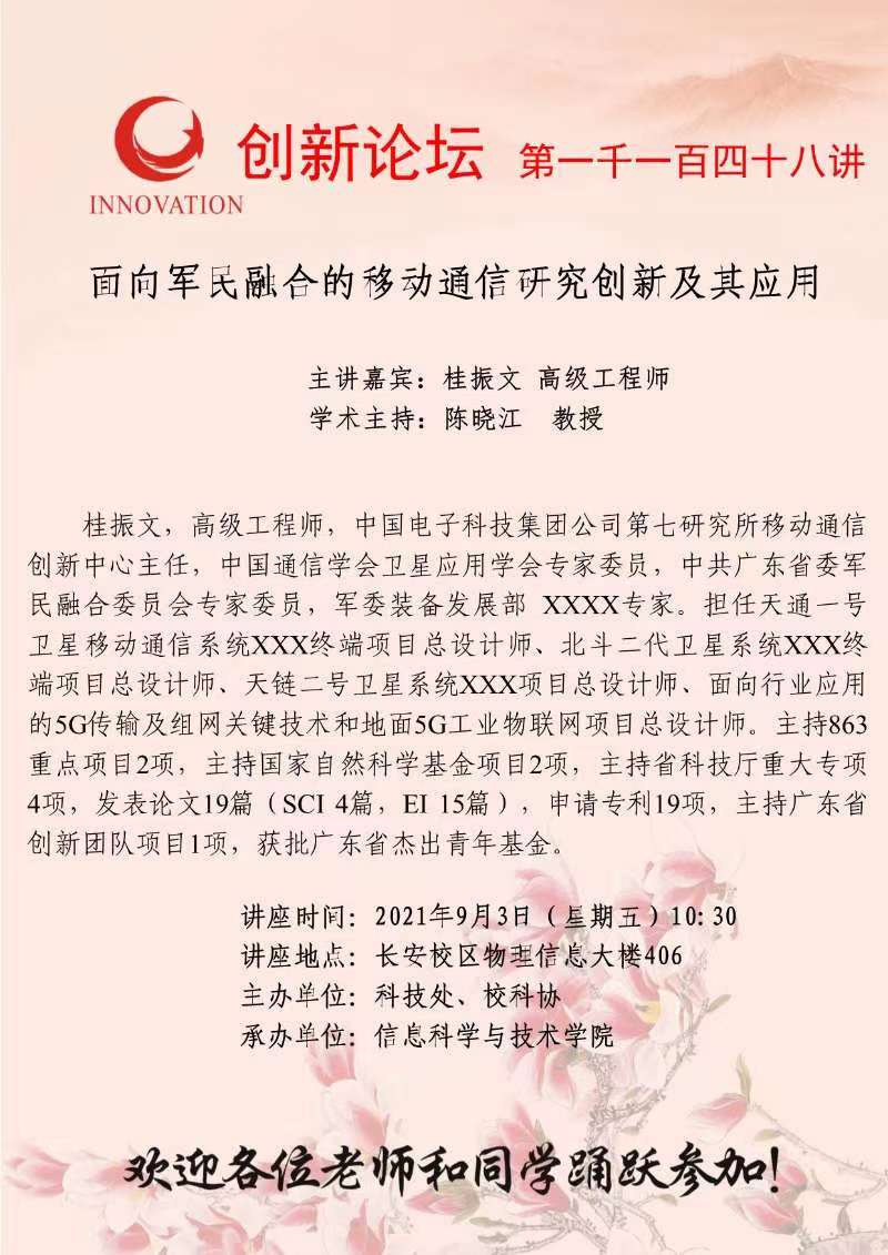 桂振文 高级工程师 开云手机网页版登录入口创新论坛第一千一百四十八讲:面向军民融合的移动通信研究创新及其应用 讲座时间 2021年9月3日(星期五)10:30 讲座地点 长安校区物理信息大楼406 讲座人介绍 桂振文 高级工程师 讲座内容
