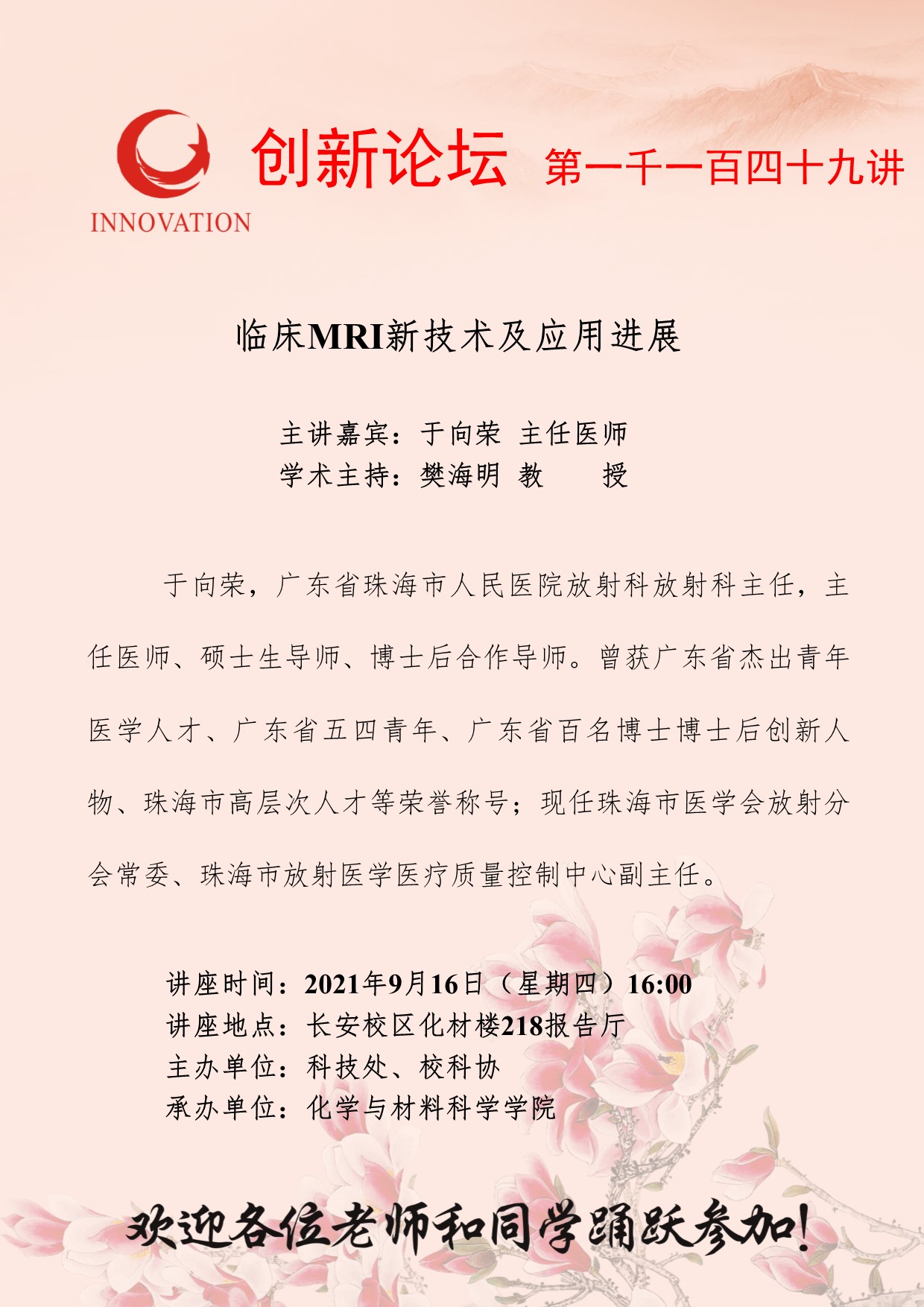 于向荣 主任医师 开云手机网页版登录入口创新论坛第一千一百四十九讲:临床MRI新技术及应用进展 讲座时间 2021年9月16日(星期四)16:00 讲座地点 长安校区化材楼218报告厅 讲座人介绍 于向荣 主任医师 讲座内容