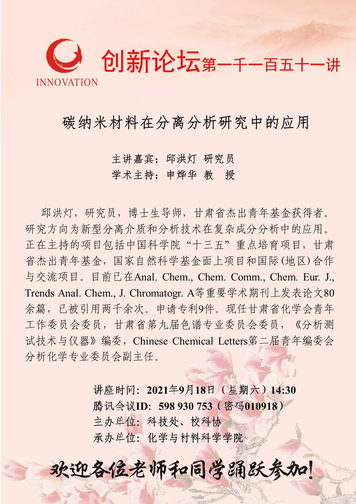 邱洪灯 研究员 开云手机网页版登录入口创新论坛第一千一百五十一讲:碳纳米材料在分离分析研究中的应用 讲座时间 2021年9月18日(星期六)14:30 讲座地点 腾讯会议ID:598 930 753 讲座人介绍 邱洪灯 研究员 讲座内容