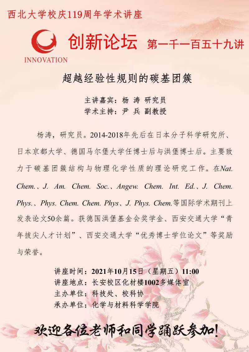杨涛 研究员 开云手机网页版登录入口创新论坛第一千一百五十九讲暨校庆119周年学术讲座:超越经验性规则的碳基团簇 讲座时间 2021年10月15日(星期五)11:00 讲座地点 长安校区化材楼1002多媒体室 讲座人介绍 杨涛 研究员 讲座内容