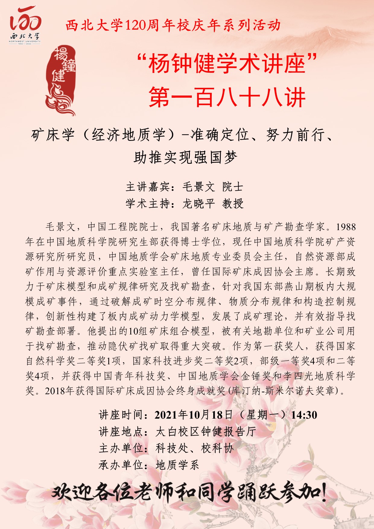 “杨钟健学术讲座”第一百八十八讲暨120周年校庆年系列活动:矿床学(经济地质学)-准确定位、努力前行、助推实现强国梦