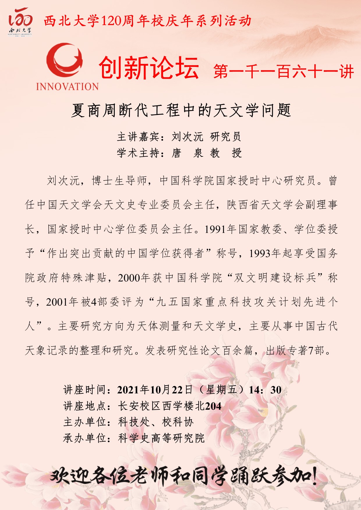 刘次沅 研究员 开云手机网页版登录入口创新论坛第一千一百六十一讲暨120周年校庆年系列活动:夏商周断代工程中的天文学问题 讲座时间 2021年10月22日(星期五)14:30 讲座地点 长安校区西学楼北204 讲座人介绍 刘次沅 研究员 讲座内容