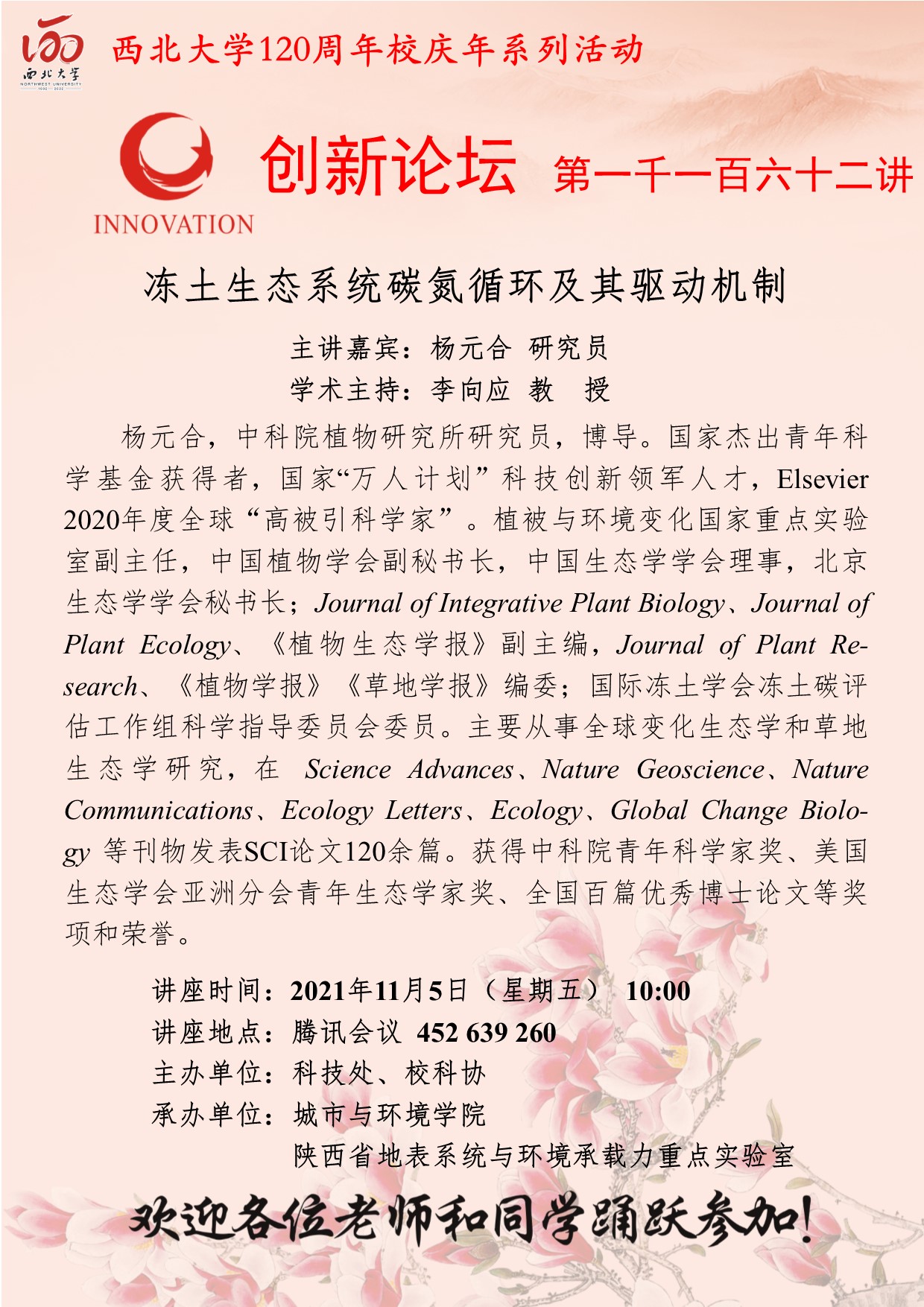 杨元合 研究员 开云手机网页版登录入口创新论坛第一千一百六十二讲暨120周年校庆年系列活动:冻土生态系统碳氮循环及其驱动机制 讲座时间 2021年11月5日(星期五)10:00 讲座地点 腾讯会议 452 639 260 讲座人介绍 杨元合 研究员 讲座内容