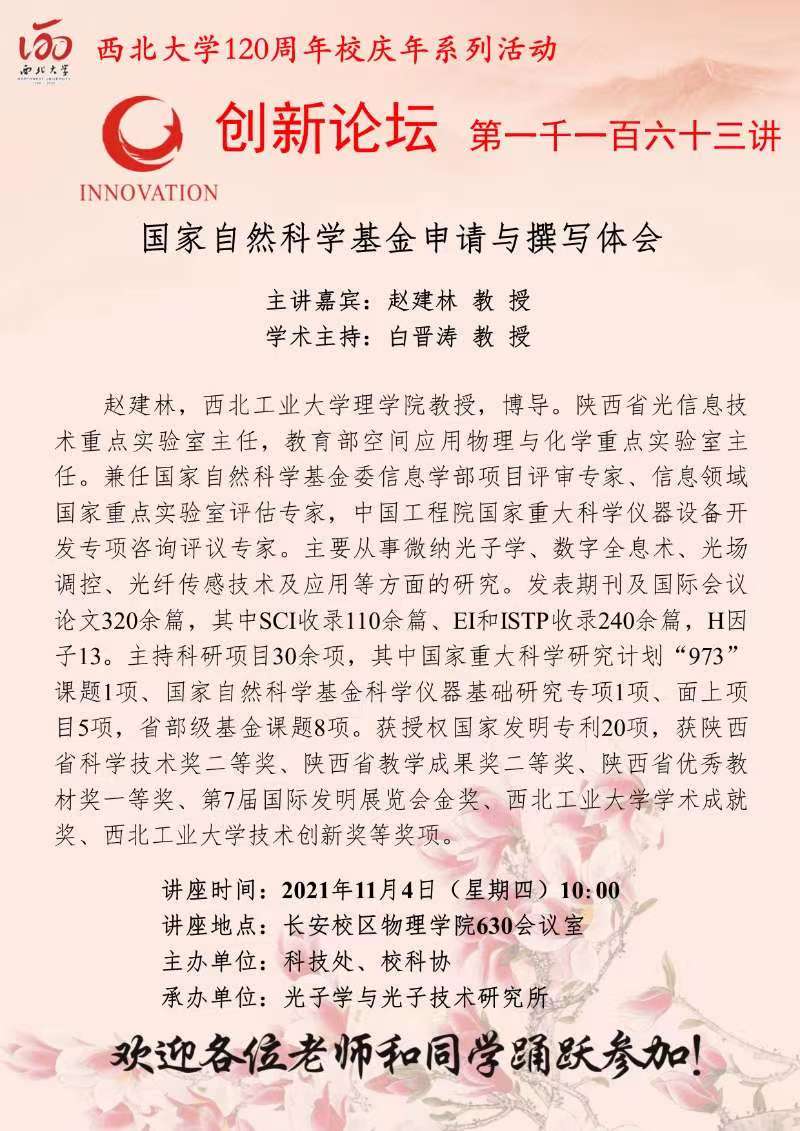 赵建林 教授 开云手机网页版登录入口创新论坛第一千一百六十三讲暨120周年校庆年系列活动:国家自然科学基金申请与撰写体会 讲座时间 2021年11月4日(星期四)10:00 讲座地点 长安校区物理学院630会议室 讲座人介绍 赵建林 教授 讲座内容