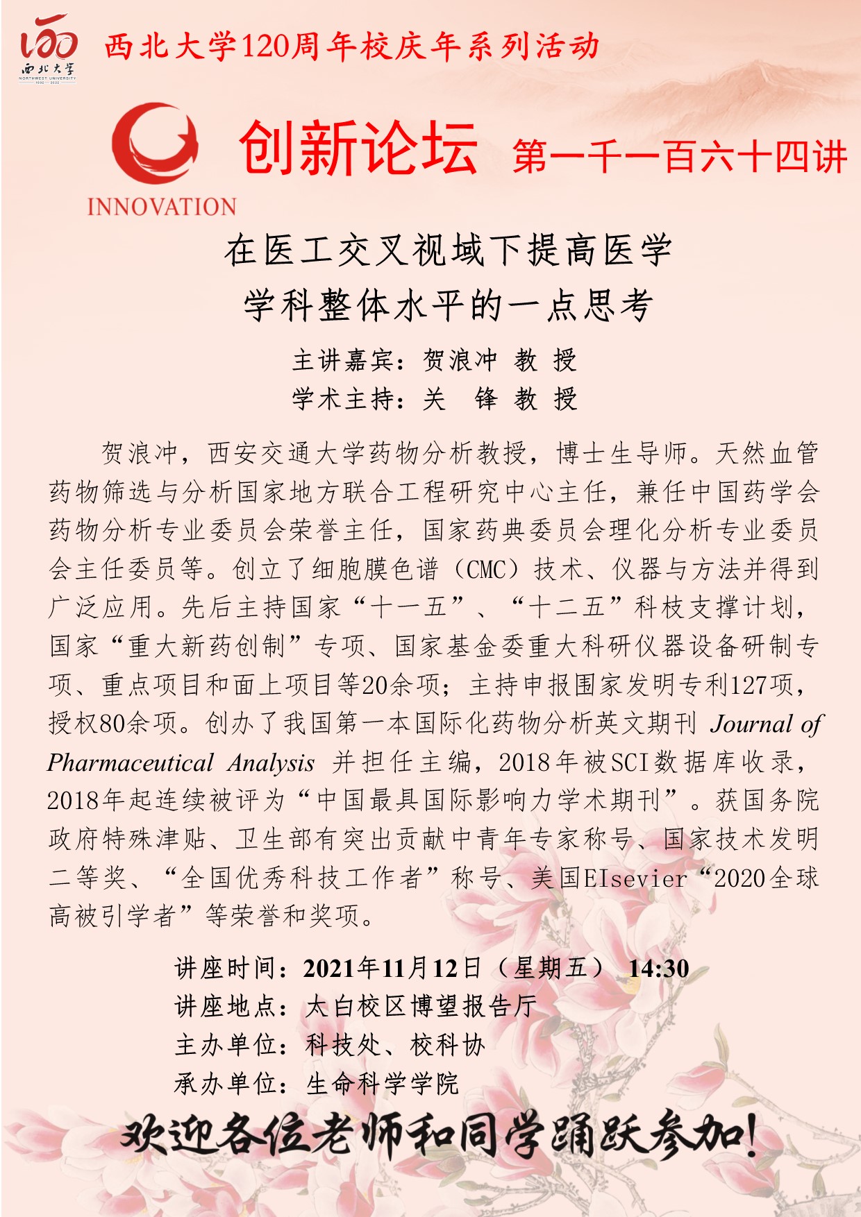 贺浪冲 教授 开云手机网页版登录入口创新论坛第一千一百六十四讲暨120周年校庆年系列活动:在医工交叉视域下提高医学学科整体水平的一点思考 讲座时间 2021年11月12日(星期五) 14:30 讲座地点 太白校区博望报告厅 讲座人介绍 贺浪冲 教授 讲座内容