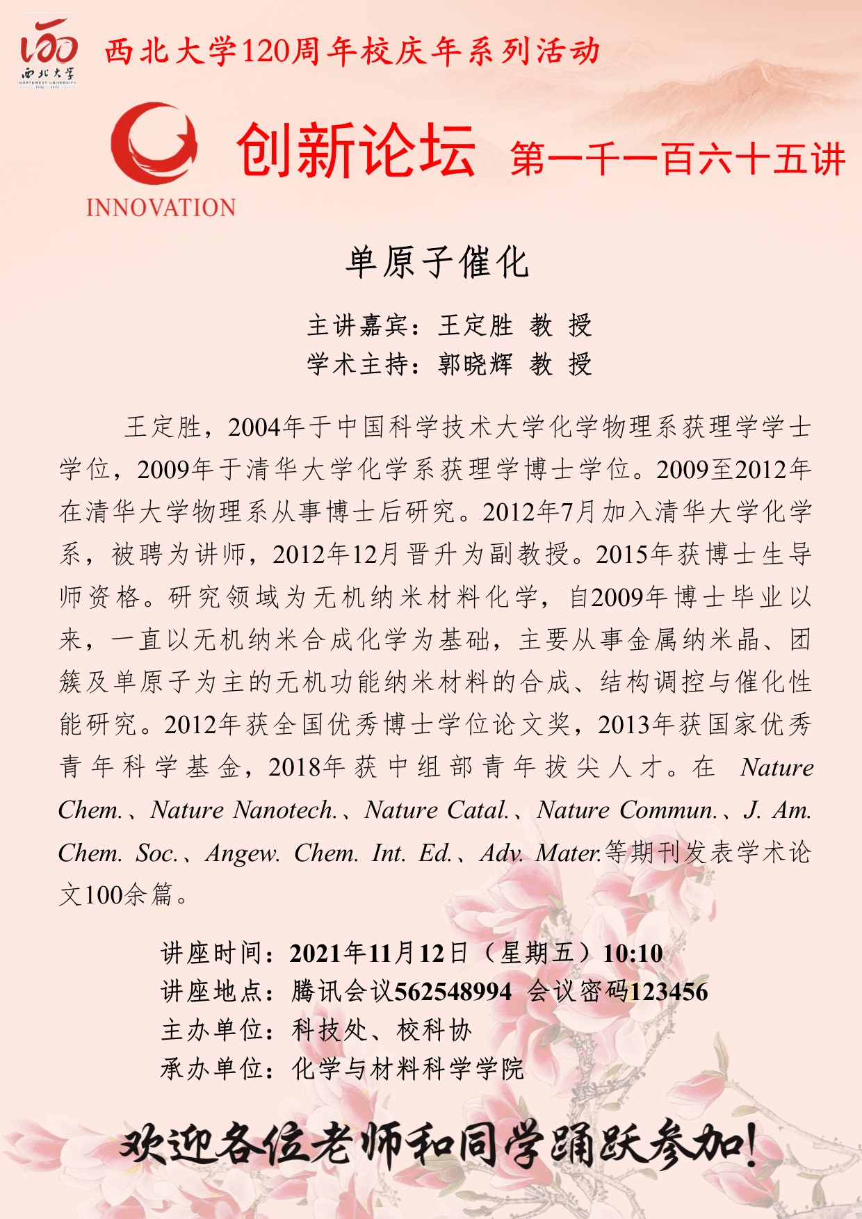 王定胜 教授 开云手机网页版登录入口创新论坛第一千一百六十五讲暨120周年校庆年系列活动:单原子催化 讲座时间 2021年11月12日(星期五)10:10 讲座地点 腾讯会议562548994 会议密码123456 讲座人介绍 王定胜 教授 讲座内容