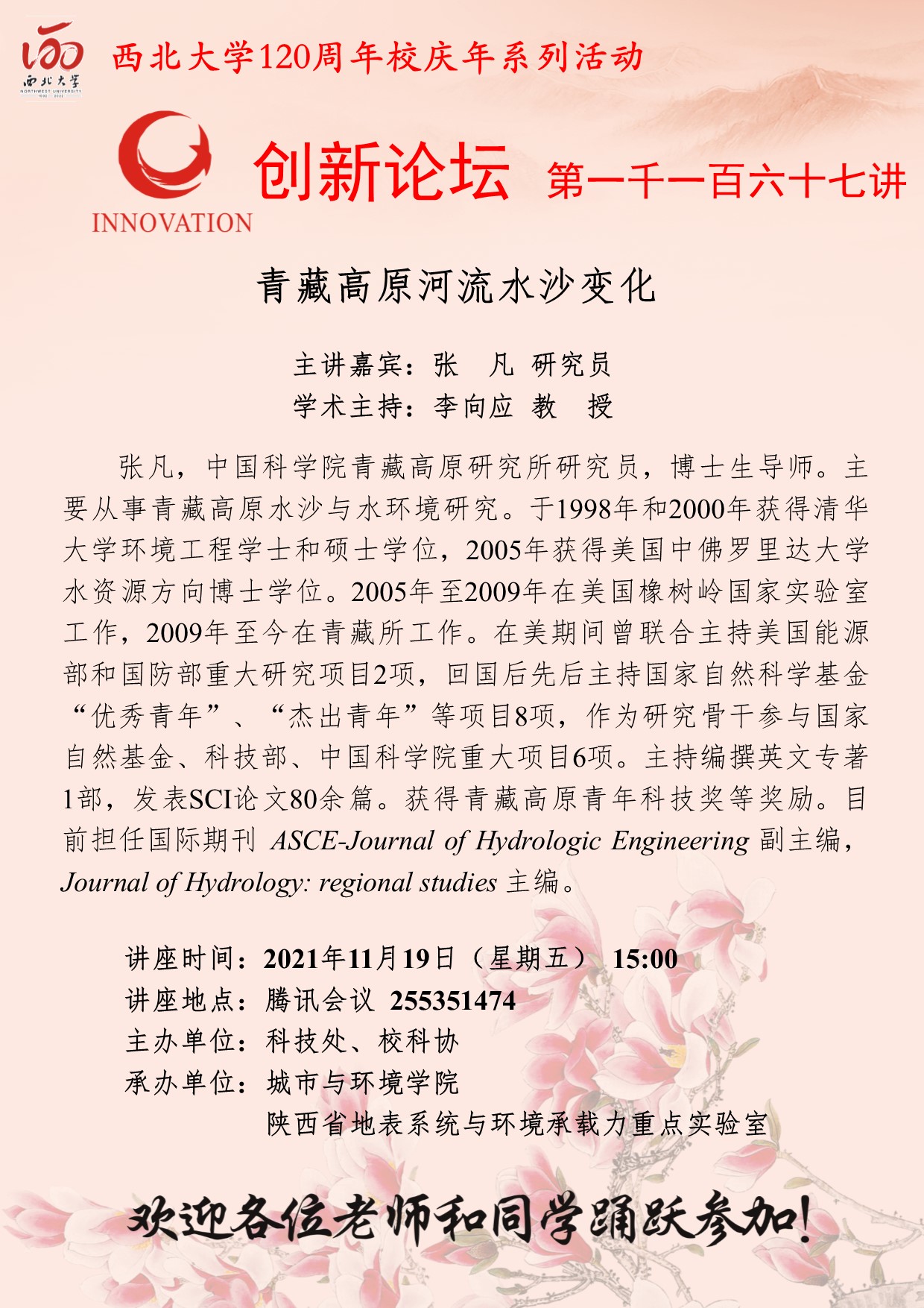 张凡 研究员 开云手机网页版登录入口创新论坛第一千一百六十七讲暨120周年校庆年系列活动:青藏高原河流水沙变化 讲座时间 2021年11月19日(星期五) 15:00 讲座地点 腾讯会议 255351474 讲座人介绍 张凡 研究员 讲座内容