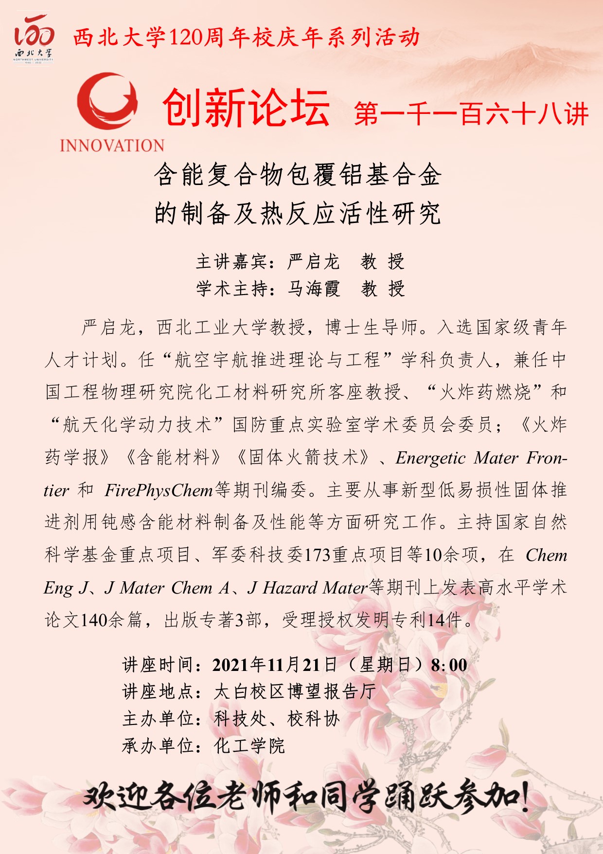 严启龙 教授 开云手机网页版登录入口创新论坛第一千一百六十八讲暨120周年校庆年系列活动:含能复合物包覆铝基合金的制备及热反应活性研究 讲座时间 2021年11月21日(星期日)8:00 讲座地点 太白校区博望报告厅 讲座人介绍 严启龙 教授 讲座内容