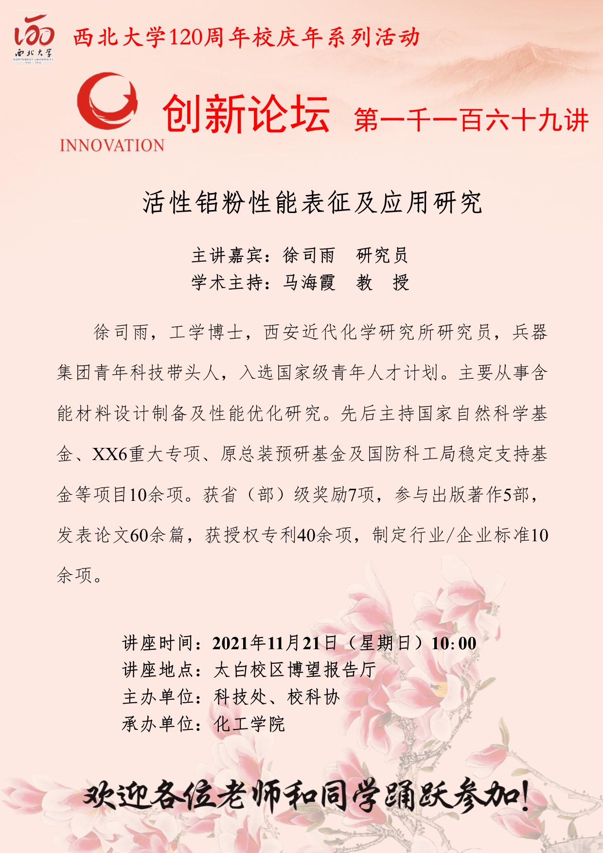 徐司雨 研究员 开云手机网页版登录入口创新论坛第一千一百六十九讲暨120周年校庆年系列活动:活性铝粉性能表征及应用研究 讲座时间 2021年11月21日(星期日)10:00 讲座地点 太白校区博望报告厅 讲座人介绍 徐司雨 研究员 讲座内容