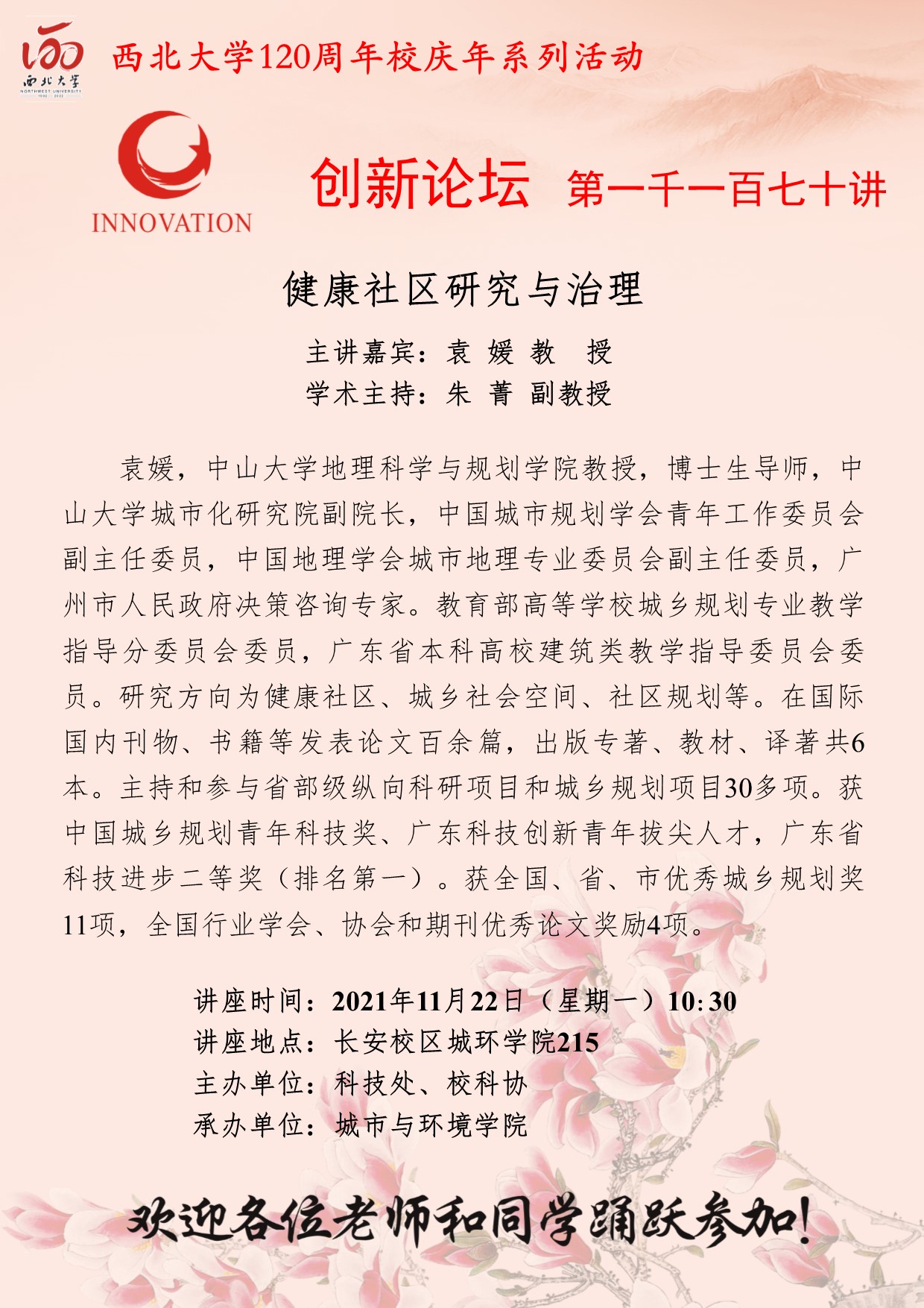 袁媛 教授 开云手机网页版登录入口创新论坛第一千一百七十讲暨120周年校庆年系列活动:健康社区研究与治理 讲座时间 2021年11月22日(星期一)10:30 讲座地点 长安校区城环学院215 讲座人介绍 袁媛 教授 讲座内容