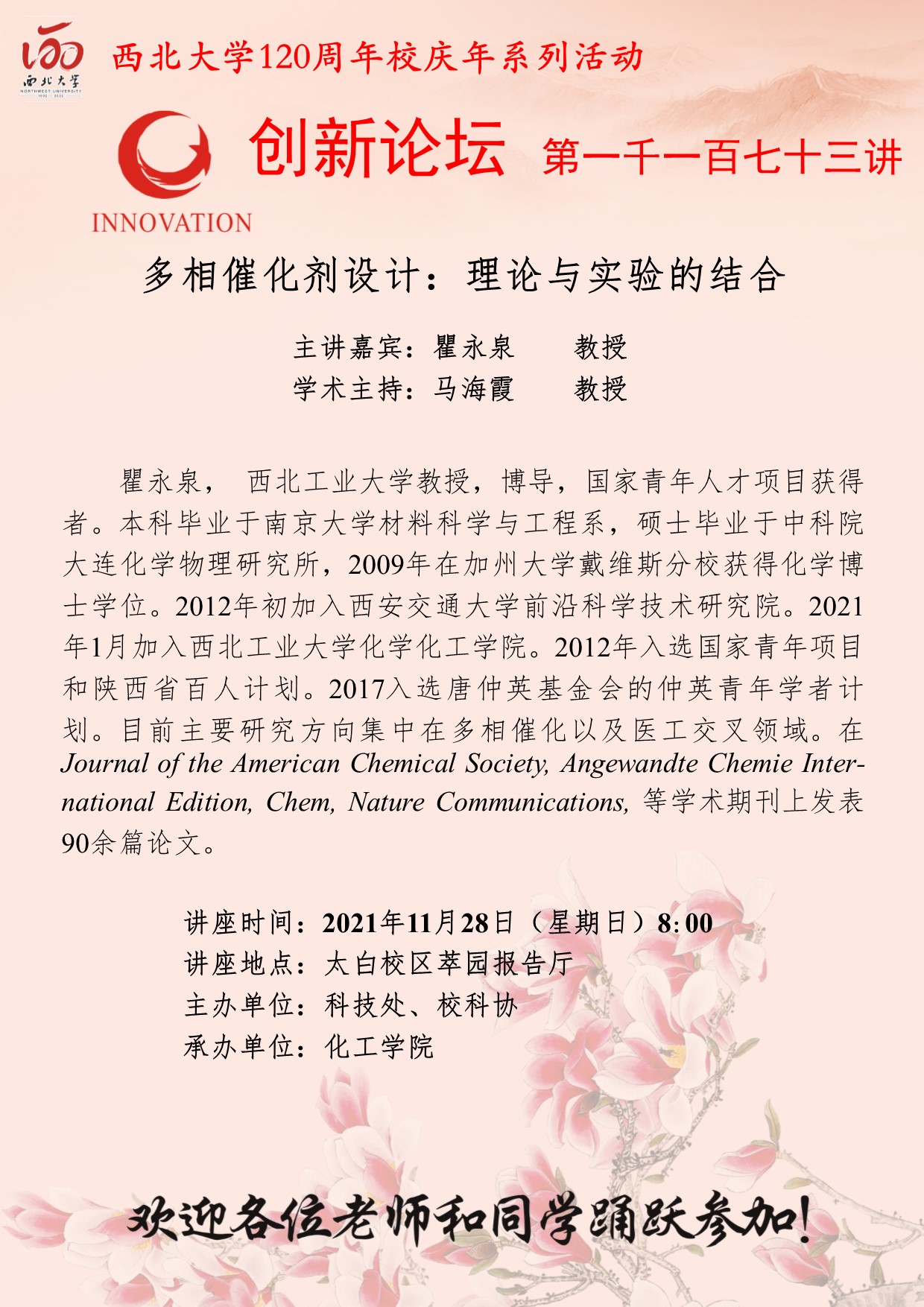 瞿永泉 教授 开云手机网页版登录入口创新论坛第一千一百七十三讲暨120周年校庆年系列活动:多相催化剂设计:理论与实验的结合 讲座时间 2021年11月28日(星期日)8:00 讲座地点 太白校区萃园报告厅 讲座人介绍 瞿永泉 教授 讲座内容