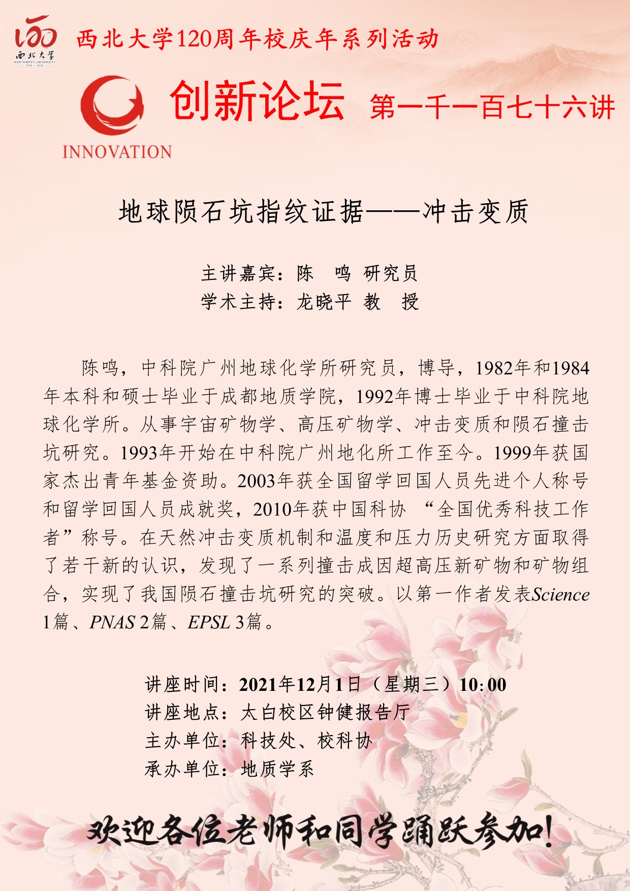 陈鸣 研究员 开云手机网页版登录入口创新论坛第一千一百七十六讲暨120周年校庆年系列活动:地球陨石坑指纹证据——冲击变质 讲座时间 2021年12月1日(星期三)10:00 讲座地点 太白校区钟健报告厅 讲座人介绍 陈鸣 研究员 讲座内容