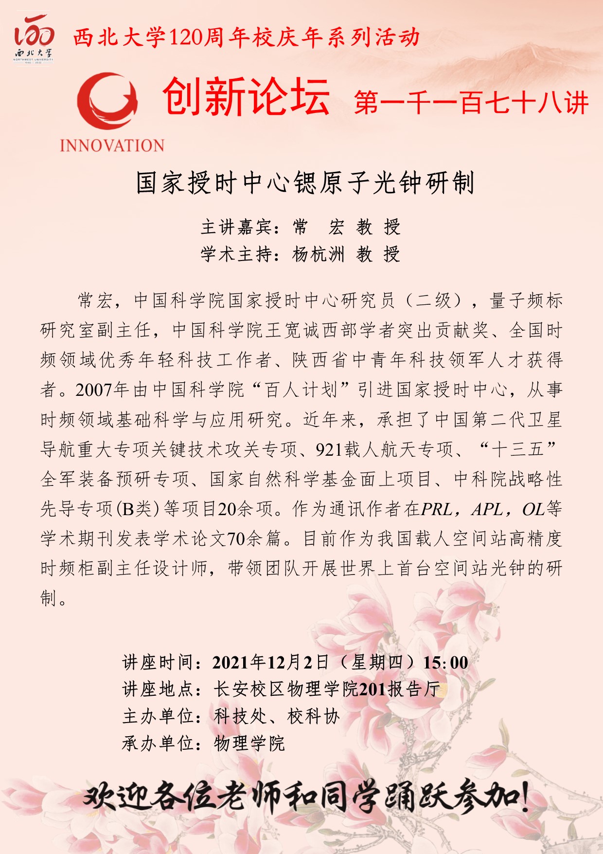 常宏 教授 开云手机网页版登录入口创新论坛第一千一百七十八讲暨120周年校庆年系列活动:国家授时中心锶原子光钟研制 讲座时间 2021年12月2日(星期四)15:00 讲座地点 长安校区物理学院201报告厅 讲座人介绍 常宏 教授 讲座内容