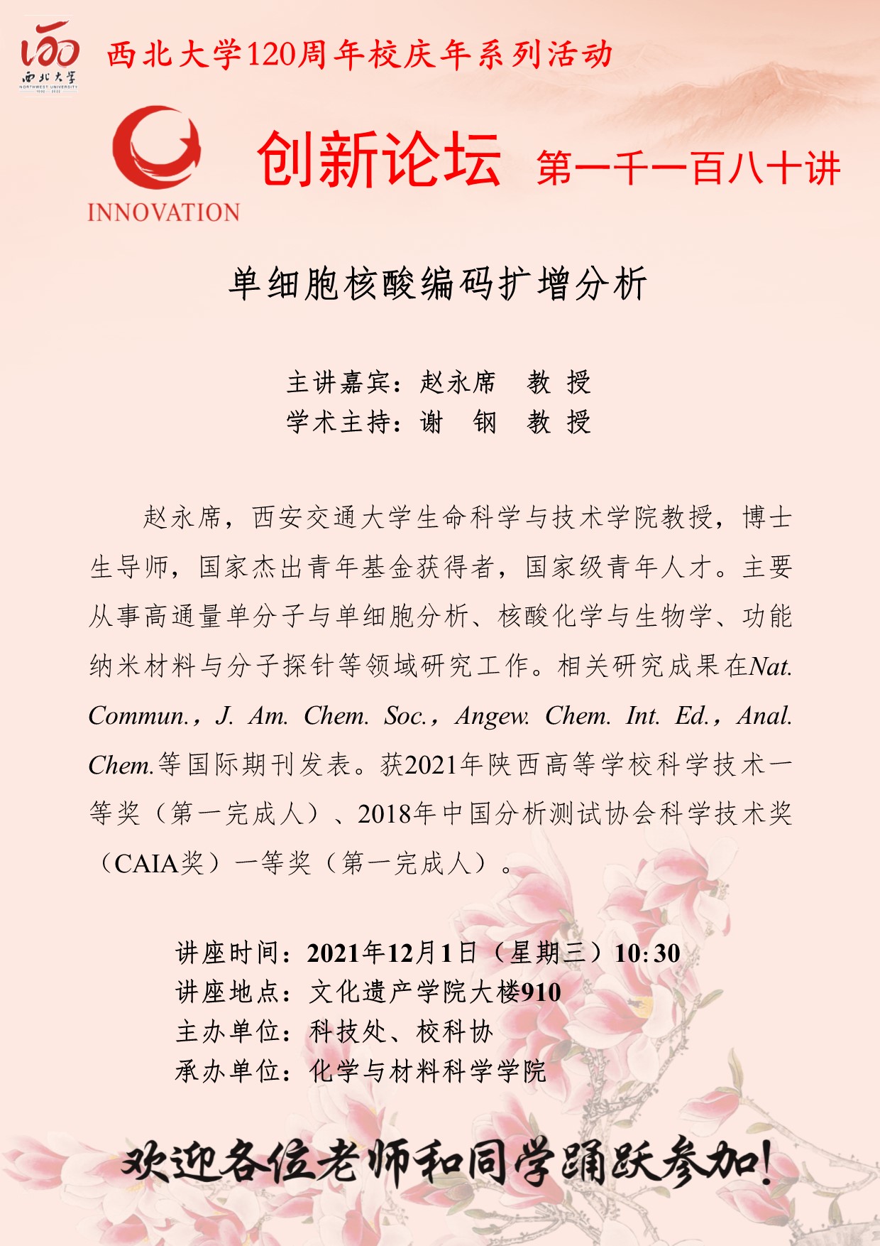 赵永席 教授 开云手机网页版登录入口创新论坛第一千一百八十讲暨120周年校庆年系列活动:单细胞核酸编码扩增分析 讲座时间 2021年12月1日(星期三)10:30 讲座地点 文化遗产学院大楼910 讲座人介绍 赵永席 教授 讲座内容