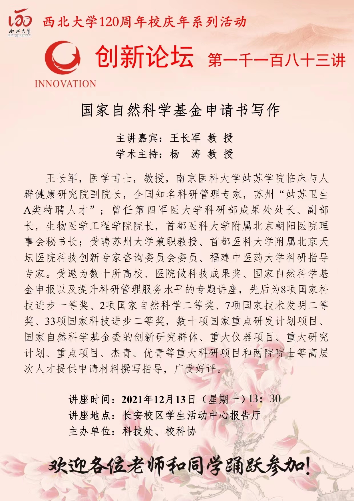王长军 教授 开云手机网页版登录入口创新论坛第一千一百八十三讲暨120周年校庆年系列活动:国家自然科学基金申请书写作 讲座时间 2021年12月13日(星期一)13:30 讲座地点 长安校区学生活动中心报告厅 讲座人介绍 王长军 教授 讲座内容
