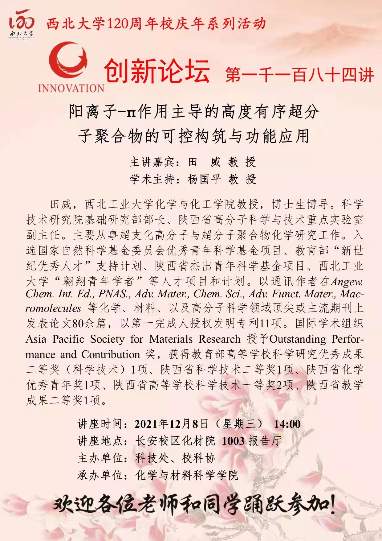 田威 教授 开云手机网页版登录入口创新论坛第一千一百八十四讲暨120周年校庆年系列活动:阳离子-π作用主导的高度有序超分子聚合物的可控构筑与功能应用 讲座时间 2021年12月8日(星期三) 14:00 讲座地点 长安校区化材院 1003 报告厅 讲座人介绍 田威 教授 讲座内容