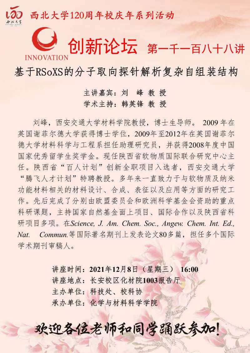 刘峰 教授 开云手机网页版登录入口创新论坛第一千一百八十八讲暨120周年校庆年系列活动:基于RSoXS的分子取向探针解析复杂自组装结构 讲座时间 2021年12月8日(星期三) 16:00 讲座地点 长安校区化材院1003报告厅 讲座人介绍 刘峰 教授 讲座内容