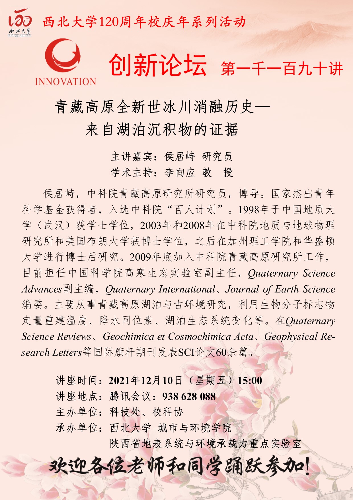 侯居峙 研究员 开云手机网页版登录入口创新论坛第一千一百九十讲暨120周年校庆年系列活动:青藏高原全新世冰川消融历史—来自湖泊沉积物的证据 讲座时间 2021年12月10日(星期五)15:00 讲座地点 腾讯会议:938628088 讲座人介绍 侯居峙 研究员 讲座内容