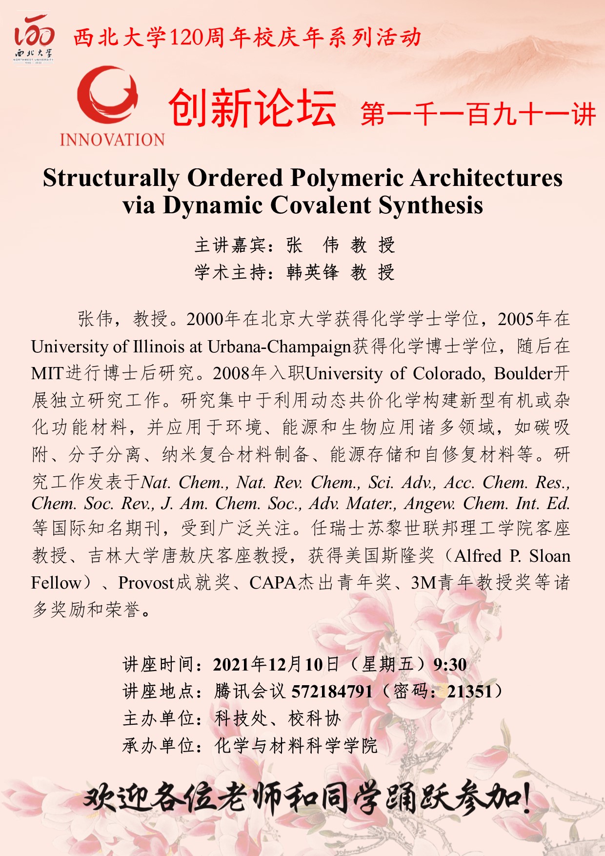 张伟 教授 开云手机网页版登录入口创新论坛第一千一百九十一讲暨120周年校庆年系列活动:Structurally Ordered Polymeric Architectures via Dynamic Covalent Synthesis 讲座时间 2021年12月10日(星期五)9:30 讲座地点 腾讯会议 572184791(密码:21351) 讲座人介绍 张伟 教授 讲座内容