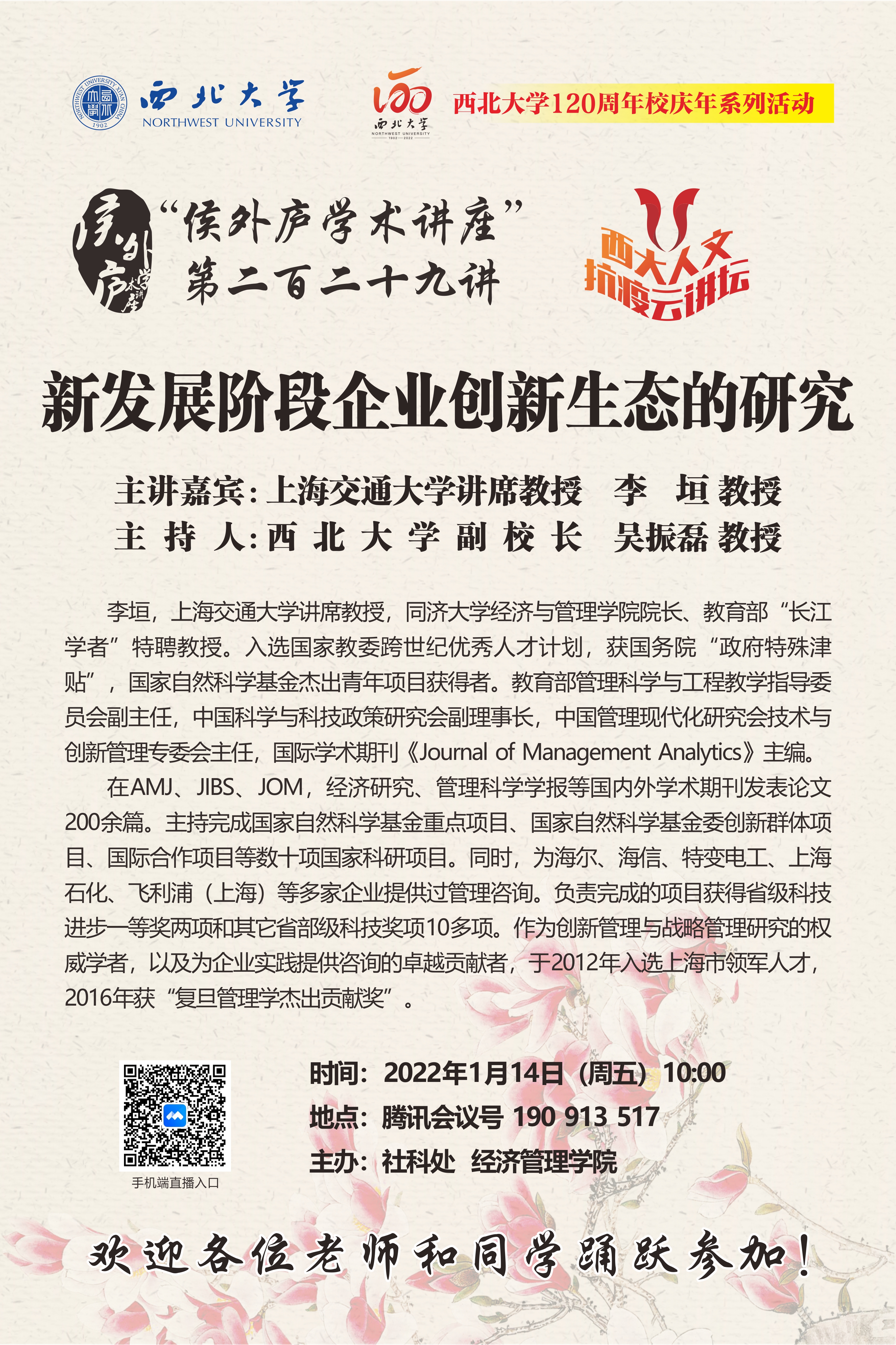 侯外庐学术讲座第二百二十九讲暨西大人文抗疫云讲坛:新发展阶段企业创新生态的研究