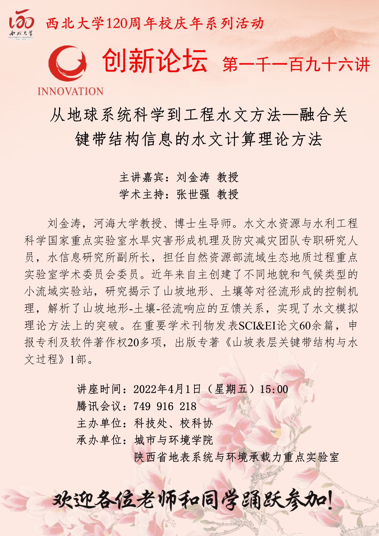 刘金涛 教授 开云手机网页版登录入口创新论坛第一千一百九十六讲暨120周年校庆年系列活动:从地球系统科学到工程水文方法—融合关键带结构信息的水文计算理论方法 讲座时间 2022年4月1日(星期五)15:00 讲座地点 腾讯会议:749 916 218 讲座人介绍 刘金涛 教授 讲座内容