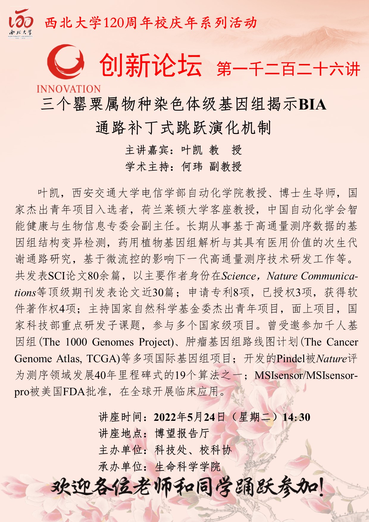 叶凯 教授 开云手机网页版登录入口创新论坛第一千二百二十六讲暨120周年校庆年系列活动:三个罂粟属物种染色体级基因组揭示BIA通路补丁式跳跃演化机制 讲座时间 2022年5月24日(星期二)14:30 讲座地点 博望报告厅 讲座人介绍 叶凯 教授 讲座内容