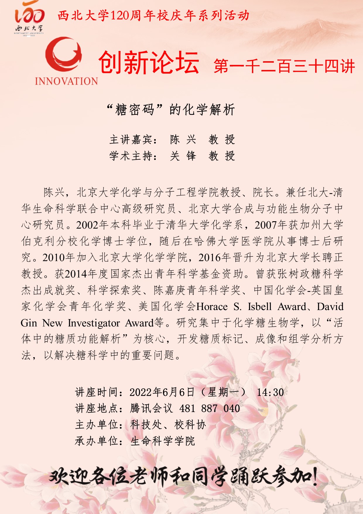陈兴 教授 开云手机网页版登录入口创新论坛第一千二百三十四讲暨120周年校庆年系列活动:“糖密码”的化学解析 讲座时间 2022年6月6日(星期一) 14:30 讲座地点 腾讯会议 481 887 040 讲座人介绍 陈兴 教授 讲座内容