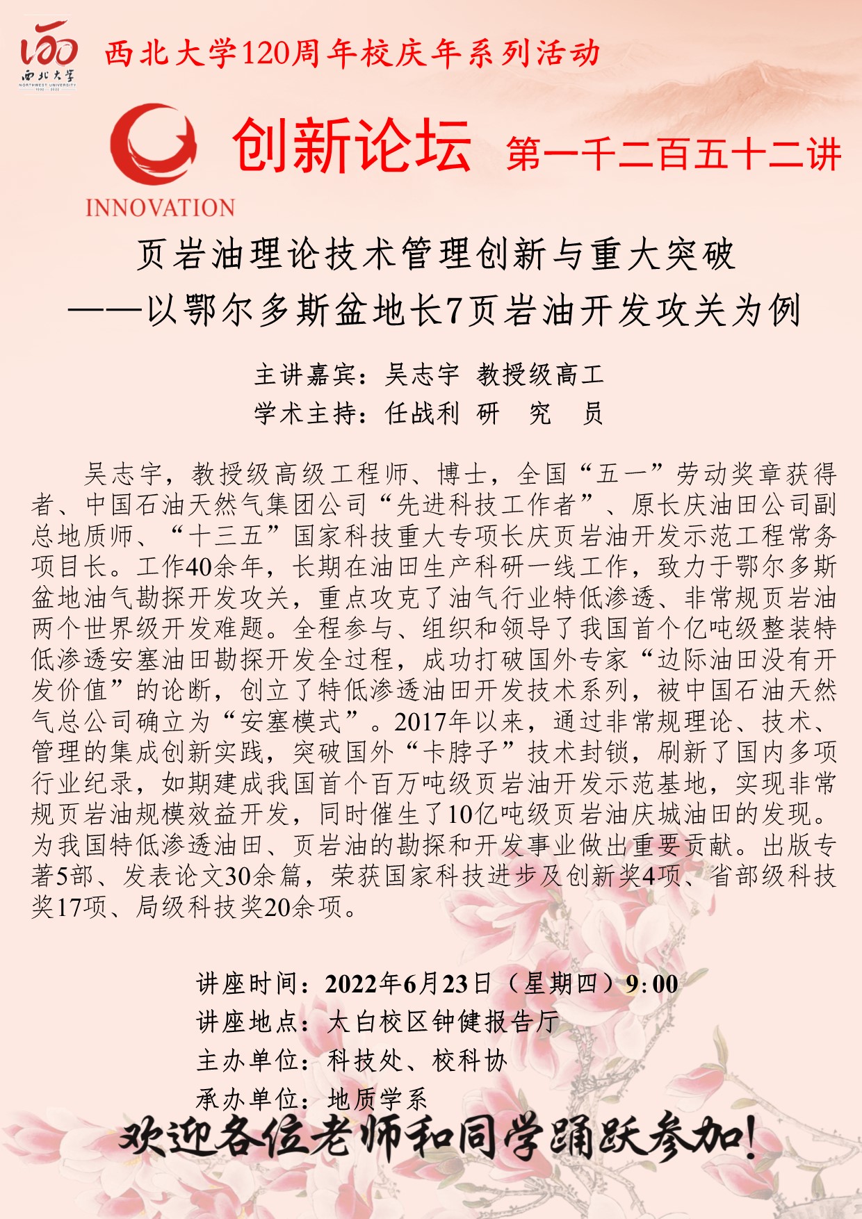 吴志宇 教授级高工 开云手机网页版登录入口创新论坛第一千二百五十二讲暨120周年校庆年系列活动:页岩油理论技术管理创新与重大突破——以鄂尔多斯盆地长7页岩油开发攻关为例 讲座时间 2022年6月23日(星期四)9:00 讲座地点 太白校区钟健报告厅 讲座人介绍 吴志宇 教授级高工 讲座内容