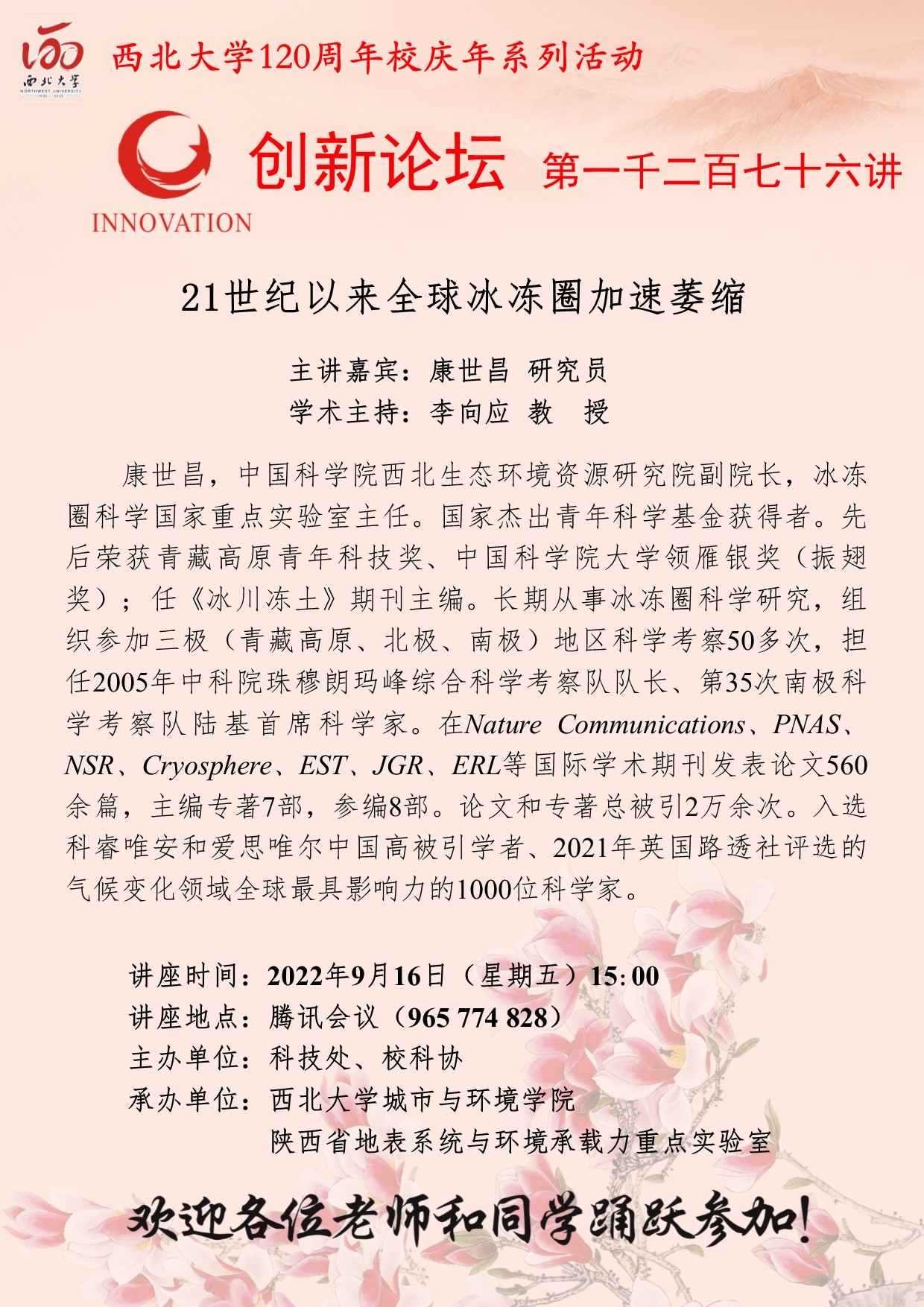 康世昌 研究员 开云手机网页版登录入口创新论坛第一千二百七十六讲暨120周年校庆年系列活动:21世纪以来全球冰冻圈加速萎缩 讲座时间 2022年9月16日(星期五)15:00 讲座地点 腾讯会议(965 774 828) 讲座人介绍 康世昌 研究员 讲座内容