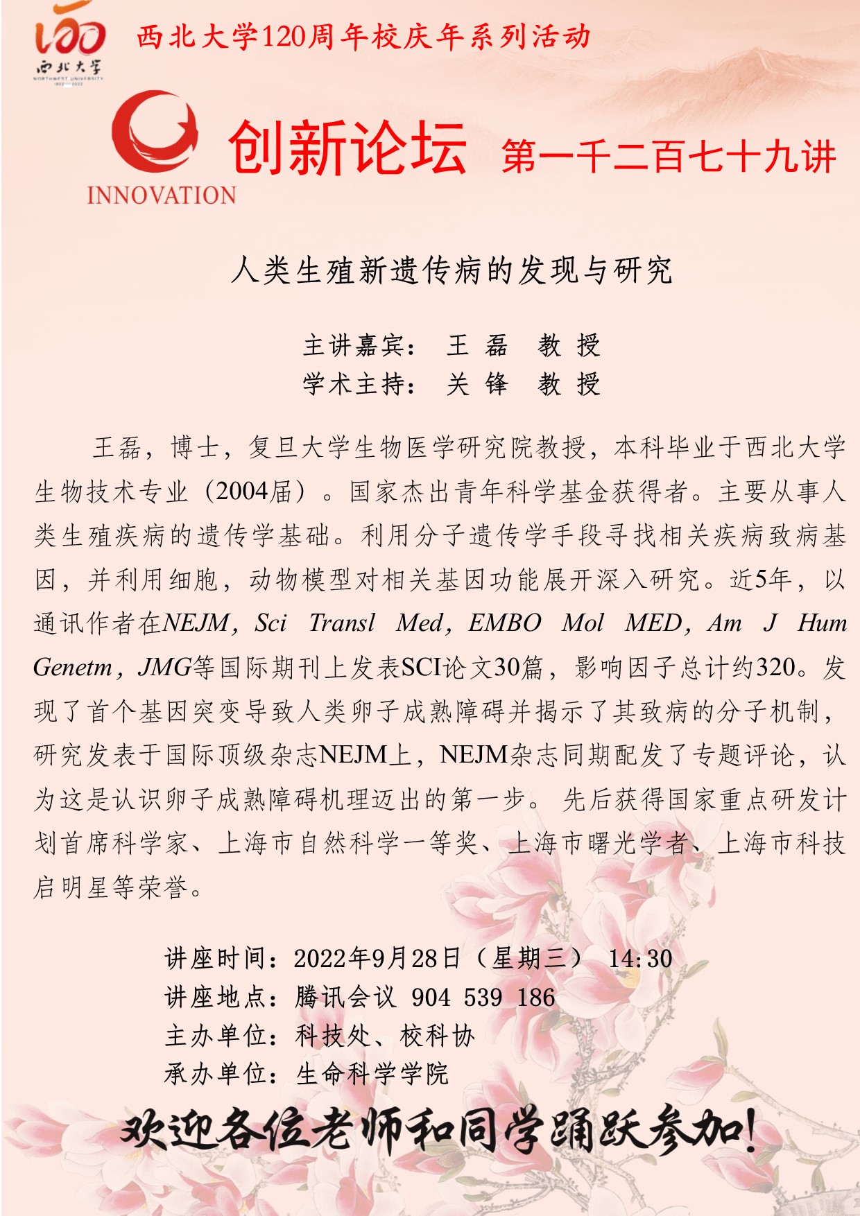 王 磊 教 授 开云手机网页版登录入口创新论坛第一千二百七十九讲暨120周年校庆年系列活动:人类生殖新遗传病的发现与研究 讲座时间 2022年9月28日(星期三) 14:30 讲座地点 腾讯会议 904 539 186 讲座人介绍 王 磊 教 授 讲座内容