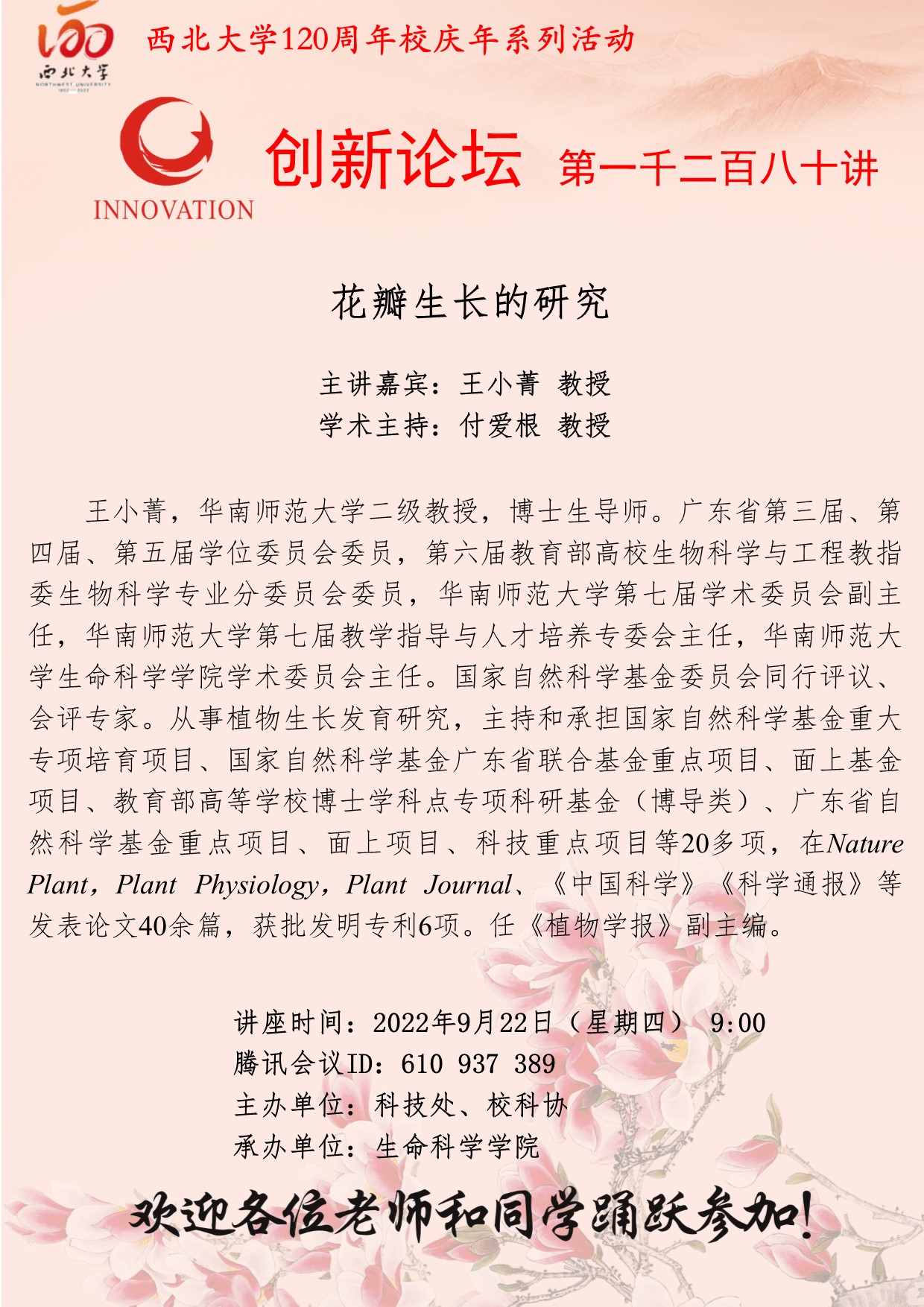 王小菁 教授 开云手机网页版登录入口创新论坛第一千二百八十讲暨120周年校庆年系列活动:花瓣生长的研究 讲座时间 2022年9月22日(星期四) 9:00 讲座地点 腾讯会议ID:610 937 389 讲座人介绍 王小菁 教授 讲座内容