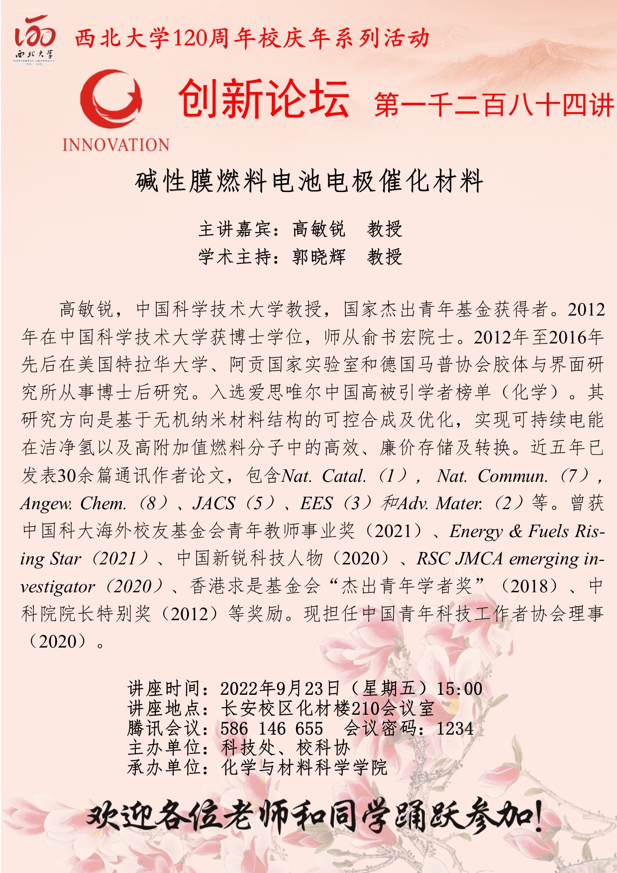 高敏锐 教授 开云手机网页版登录入口创新论坛第一千二百八十四讲暨120周年校庆年系列活动:碱性膜燃料电池电极催化材料 讲座时间 2022年9月21日(星期五) 15:00 讲座地点 长安校区化材楼210会议室 (腾讯会议:586 146 655 会议密码:1234) 讲座人介绍 高敏锐 教授 讲座内容