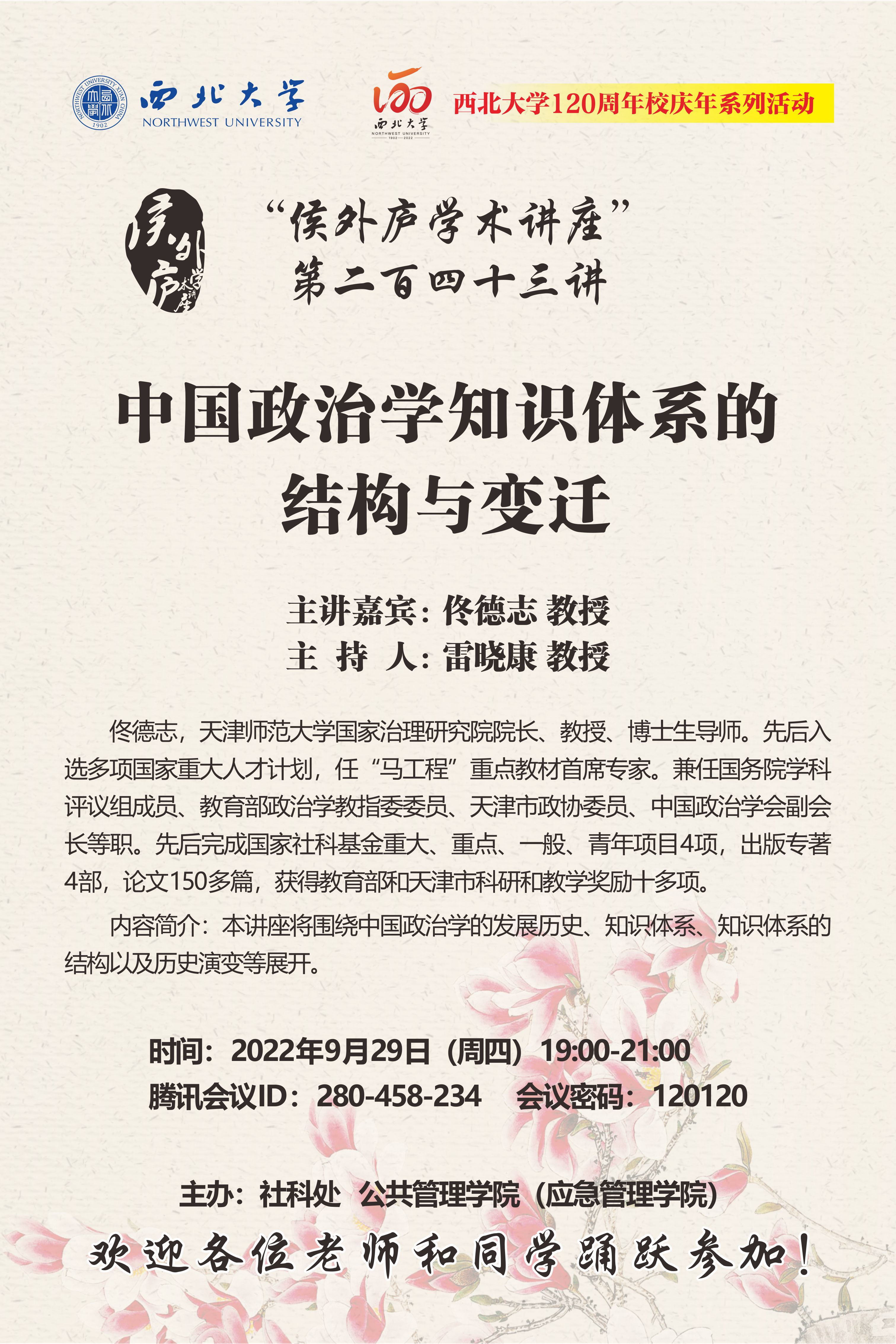 佟德志 教授 侯外庐学术讲座第二百四十三讲暨120周年校庆年系列活动:中国政治学知识体系的结构与变迁 讲座时间 2022年9月29日(周四) 19:00 讲座地点 腾讯会议ID:280-458-234 讲座人介绍 佟德志 教授 讲座内容