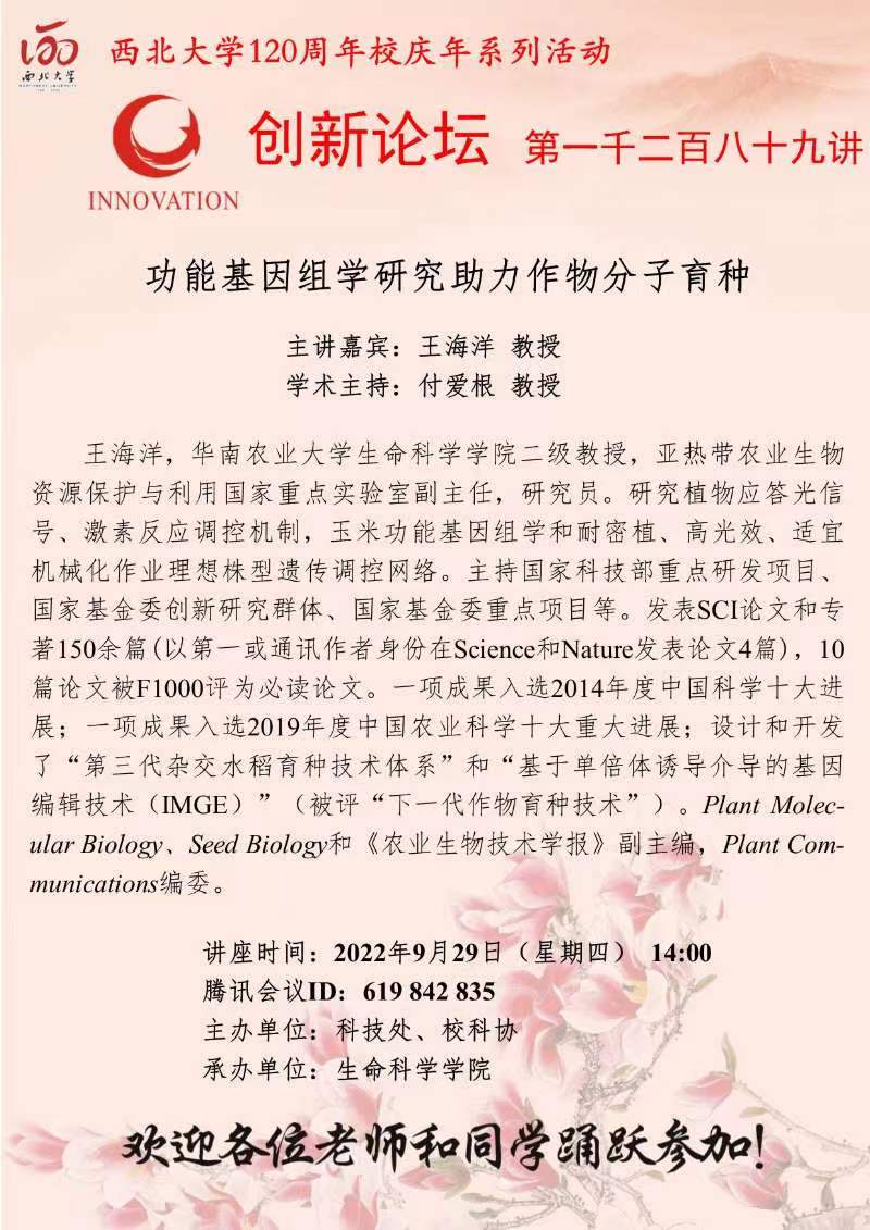 王海洋 教授 开云手机网页版登录入口创新论坛第一千二百八十九讲暨120周年校庆年系列活动: 功能基因组学研究助力作物分子育种 讲座时间 2022年9月29日(星期四) 14:00 讲座地点 腾讯会议 619 842 835 讲座人介绍 王海洋 教授 讲座内容