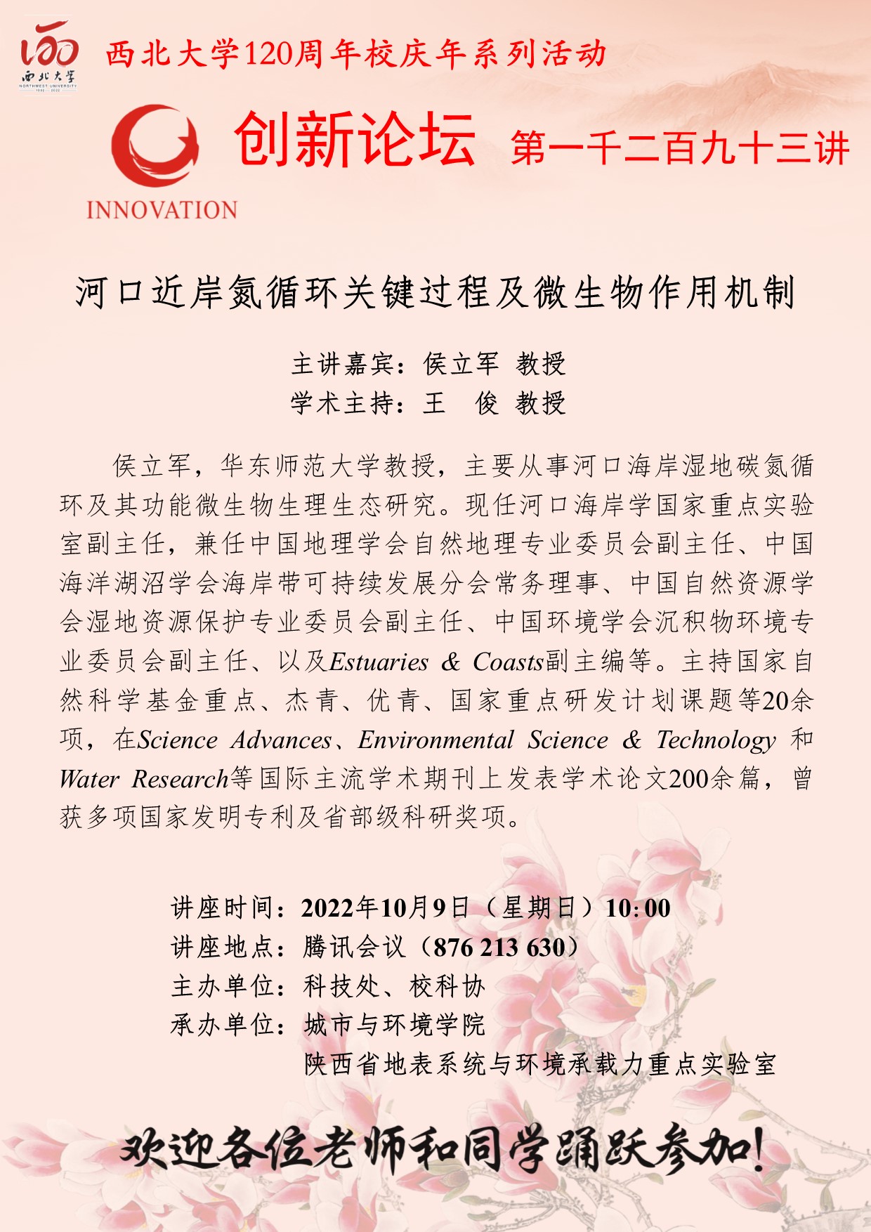 侯立军 教授 开云手机网页版登录入口创新论坛第一千二百九十三讲暨120周年校庆年系列活动: 河口近岸氮循环关键过程及微生物作用机制 讲座时间 2022年10月9日(星期日)10:00 讲座地点 腾讯会议(876 213 630) 讲座人介绍 侯立军 教授 讲座内容