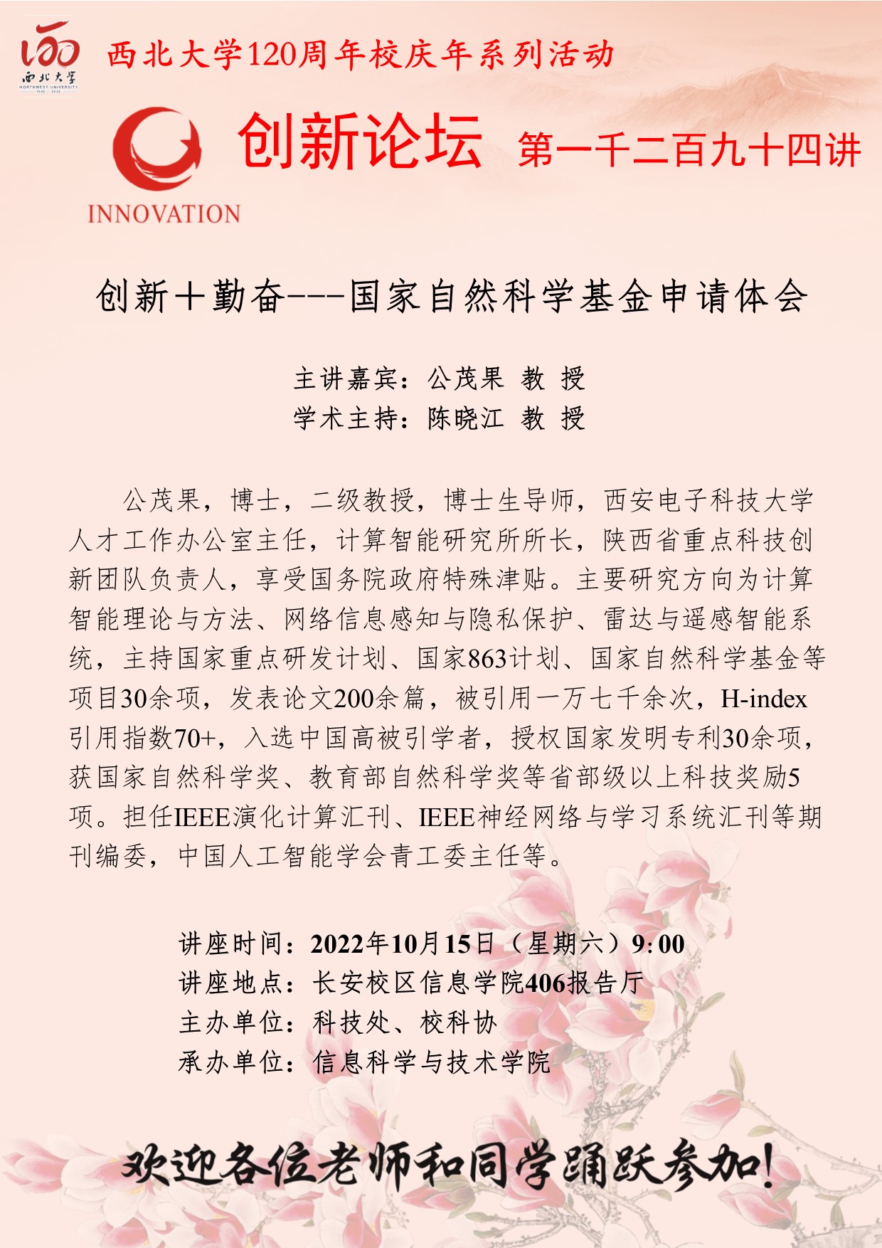 公茂果 教授 开云手机网页版登录入口创新论坛第一千二百九十四讲暨120周年校庆年系列活动: 创新+勤奋——国家自然科学基金申请体会 讲座时间 2022年10月15日(星期六)9:00 讲座地点 长安校区信息学院406报告厅 讲座人介绍 公茂果 教授 讲座内容