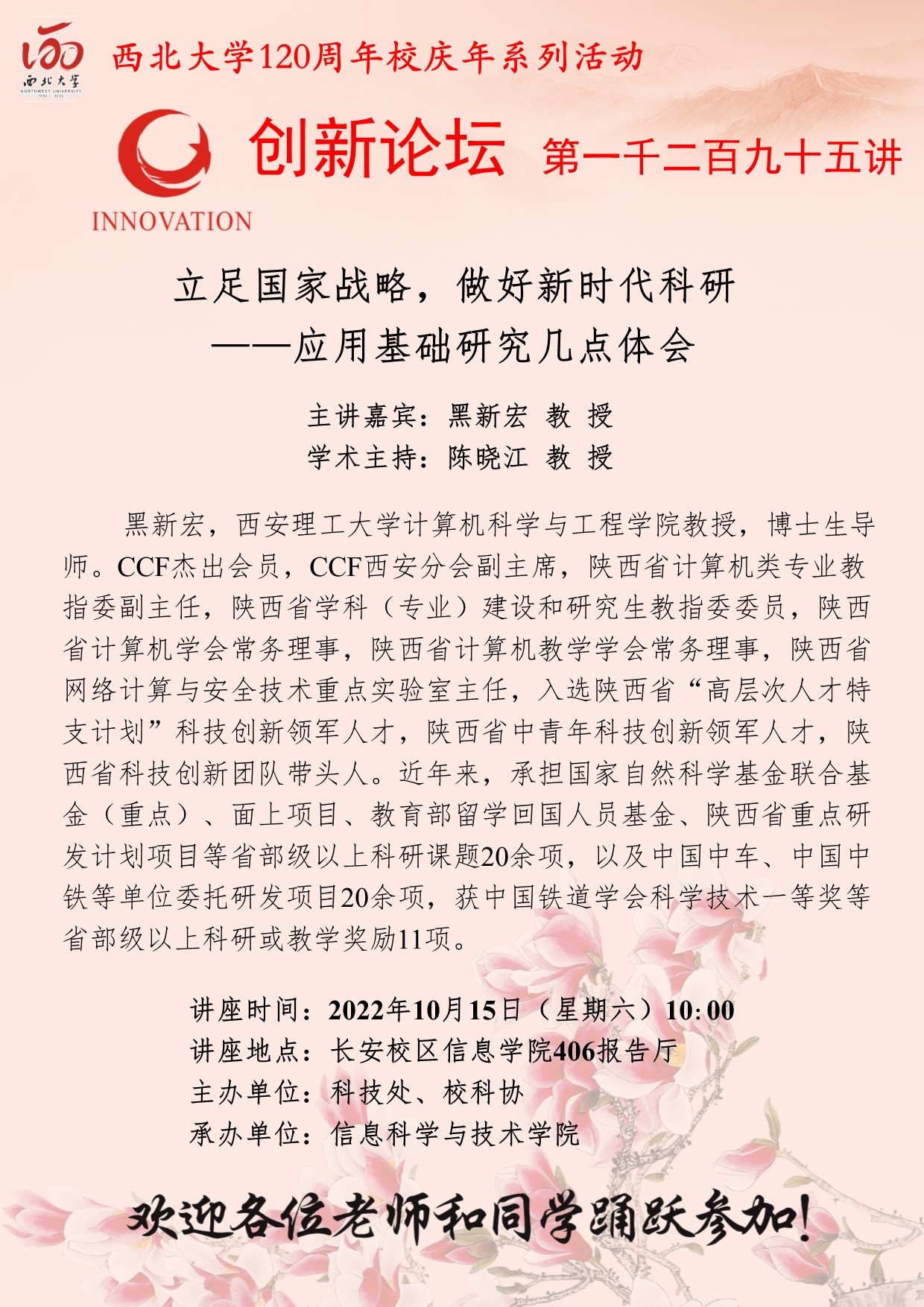 黑新宏 教授 开云手机网页版登录入口创新论坛第一千二百九十五讲暨120周年校庆年系列活动: 立足国家战略,做好新时代科研——应用基础研究几点体会 讲座时间 2022年10月15日(星期六)10:00 讲座地点 长安校区信息学院406报告厅 讲座人介绍 黑新宏 教授 讲座内容