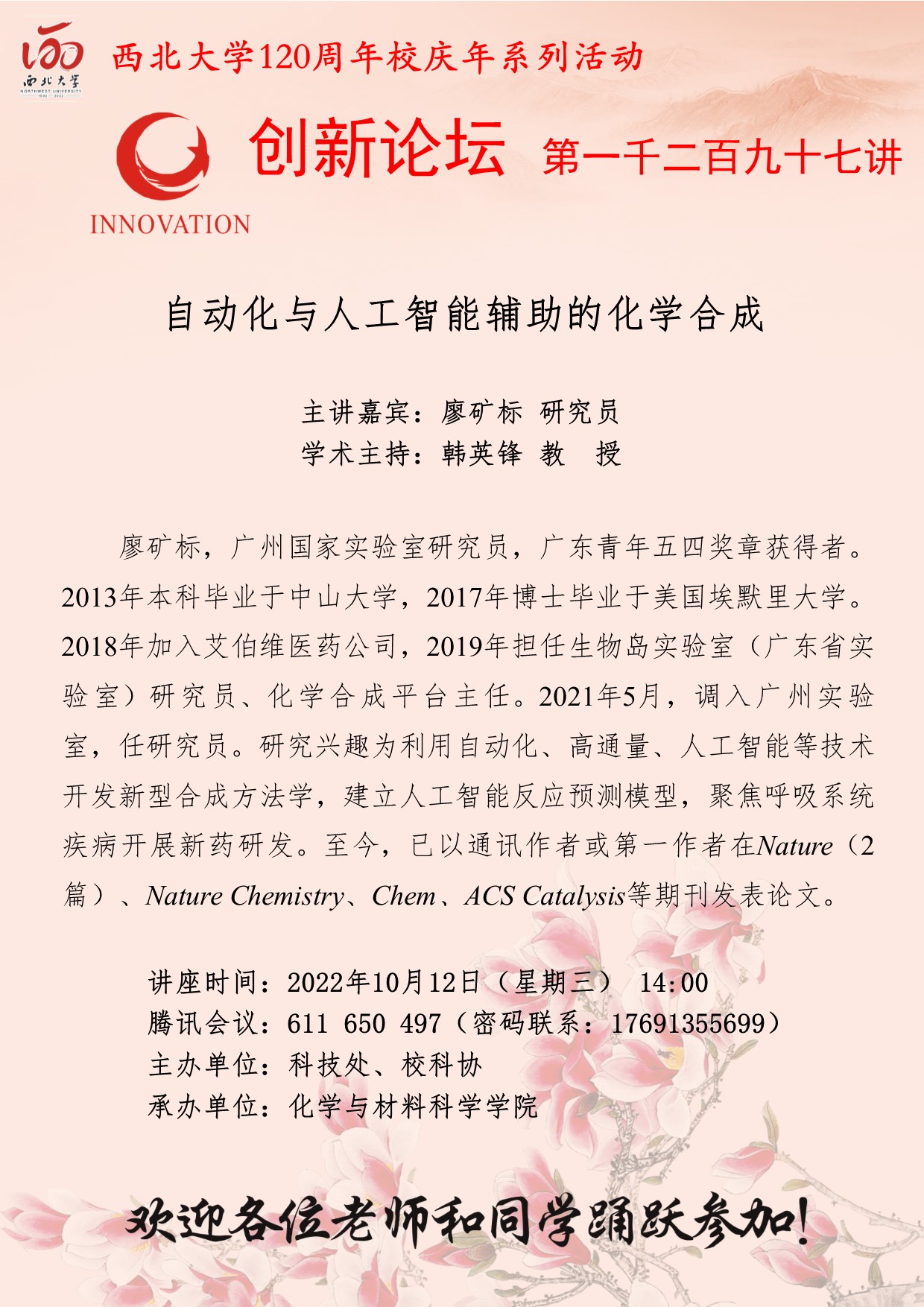廖矿标 研究员 开云手机网页版登录入口创新论坛第一千二百九十七讲暨120周年校庆年系列活动: 自动化与人工智能辅助的化学合成 讲座时间 2022年10月12日(星期三) 14:00 讲座地点 腾讯会议 611 650 497 讲座人介绍 廖矿标 研究员 讲座内容