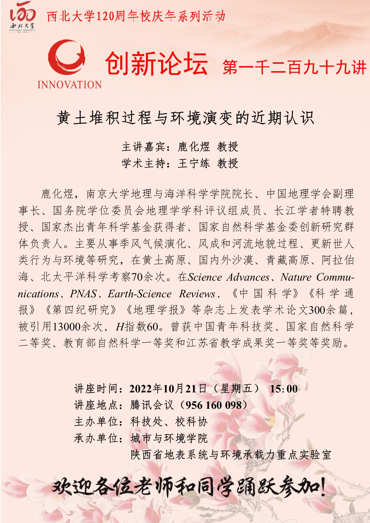鹿化煜 教授 开云手机网页版登录入口创新论坛第一千二百九十九讲暨120周年校庆年系列活动:黄土堆积过程与环境演变的近期认识 讲座时间 2022年10月21日(星期五) 15:00 讲座地点 腾讯会议(956 160 098) 讲座人介绍 鹿化煜 教授 讲座内容