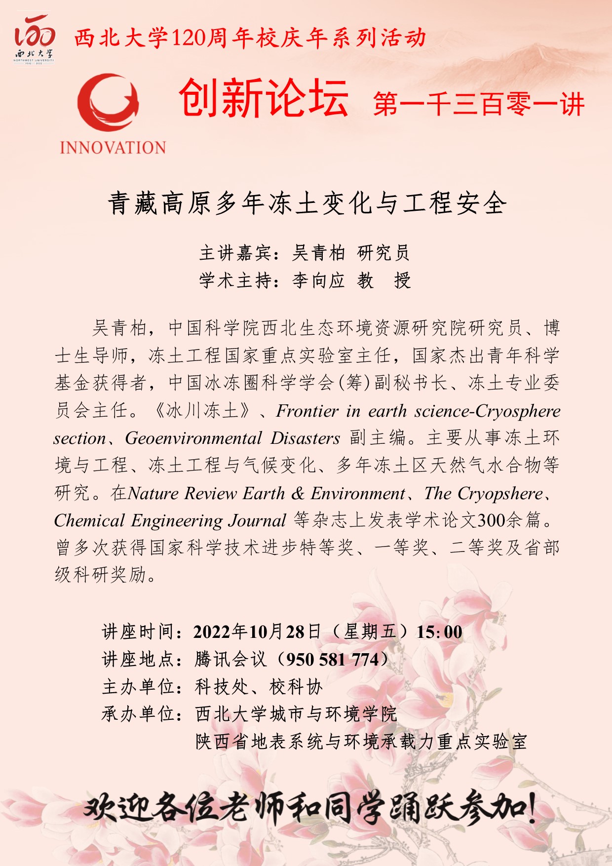 吴青柏 研究员 开云手机网页版登录入口创新论坛第一千三百零一讲暨120周年校庆年系列活动: 青藏高原多年冻土变化与工程安全 讲座时间 2022年10月28日(星期五)15:00 讲座地点 腾讯会议 950 581 774 讲座人介绍 吴青柏 研究员 讲座内容