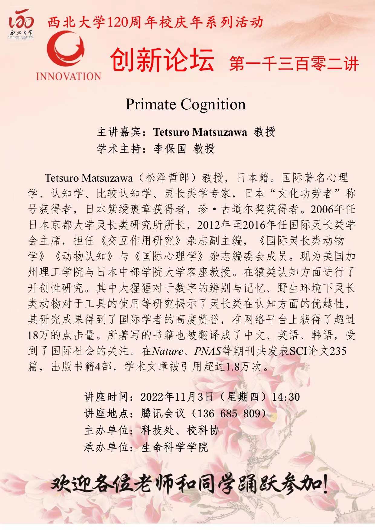 Tetsuro Matsuzawa 教授 开云手机网页版登录入口创新论坛第一千三百零二讲暨120周年校庆年系列活动: Primate Cognition 讲座时间 2022年11月3日(星期四)14:30 讲座地点 腾讯会议 136 685 809 讲座人介绍 Tetsuro Matsuzawa 教授 讲座内容