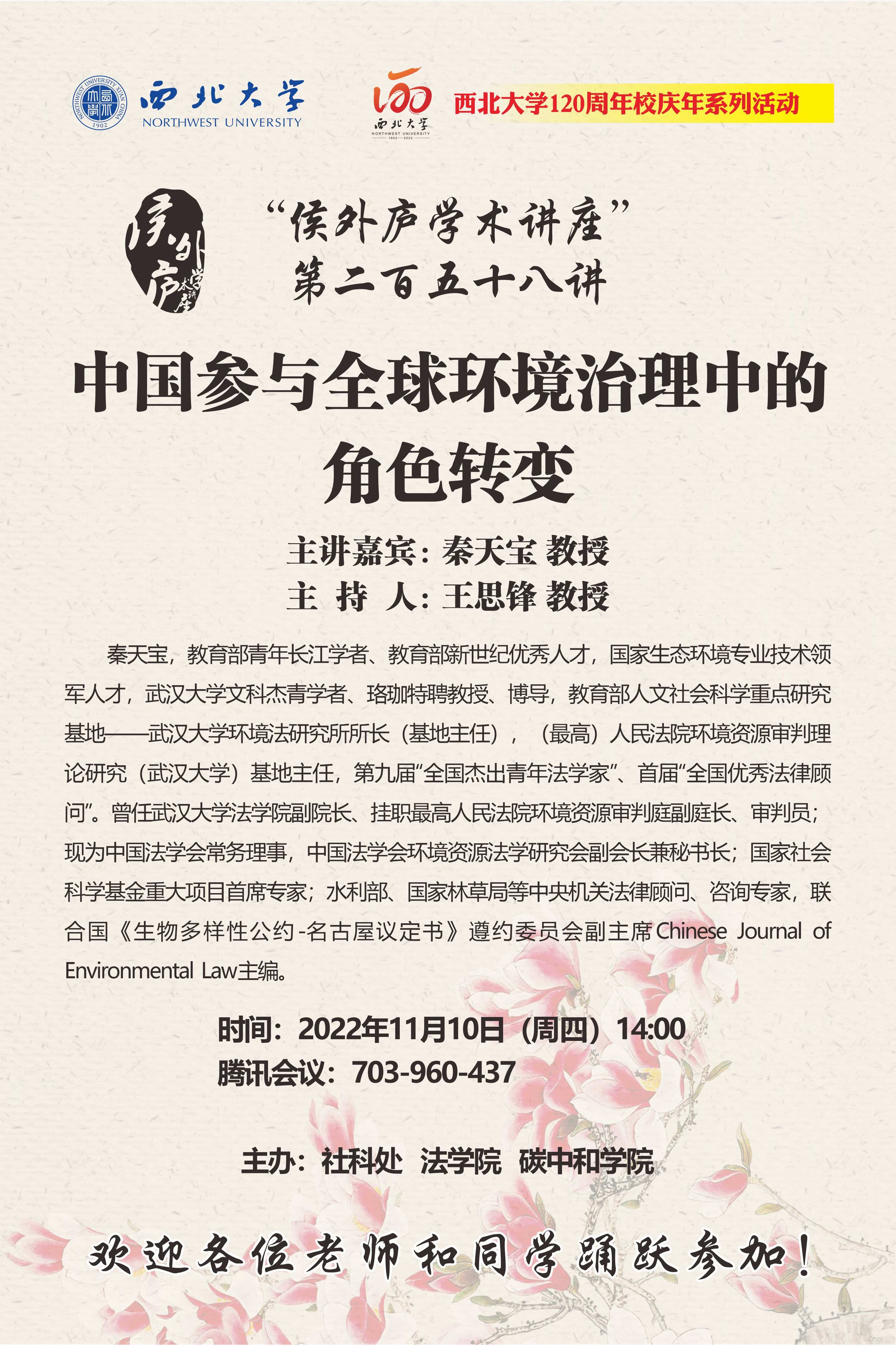 秦天宝 教授 侯外庐学术讲座第二百五十八讲暨120周年校庆年系列活动:中国参与全球环境治理中的角色转变 讲座时间 2022年11月10日(周四)14:00 讲座地点 腾讯会议:703-960-437 讲座人介绍 秦天宝 教授 讲座内容
