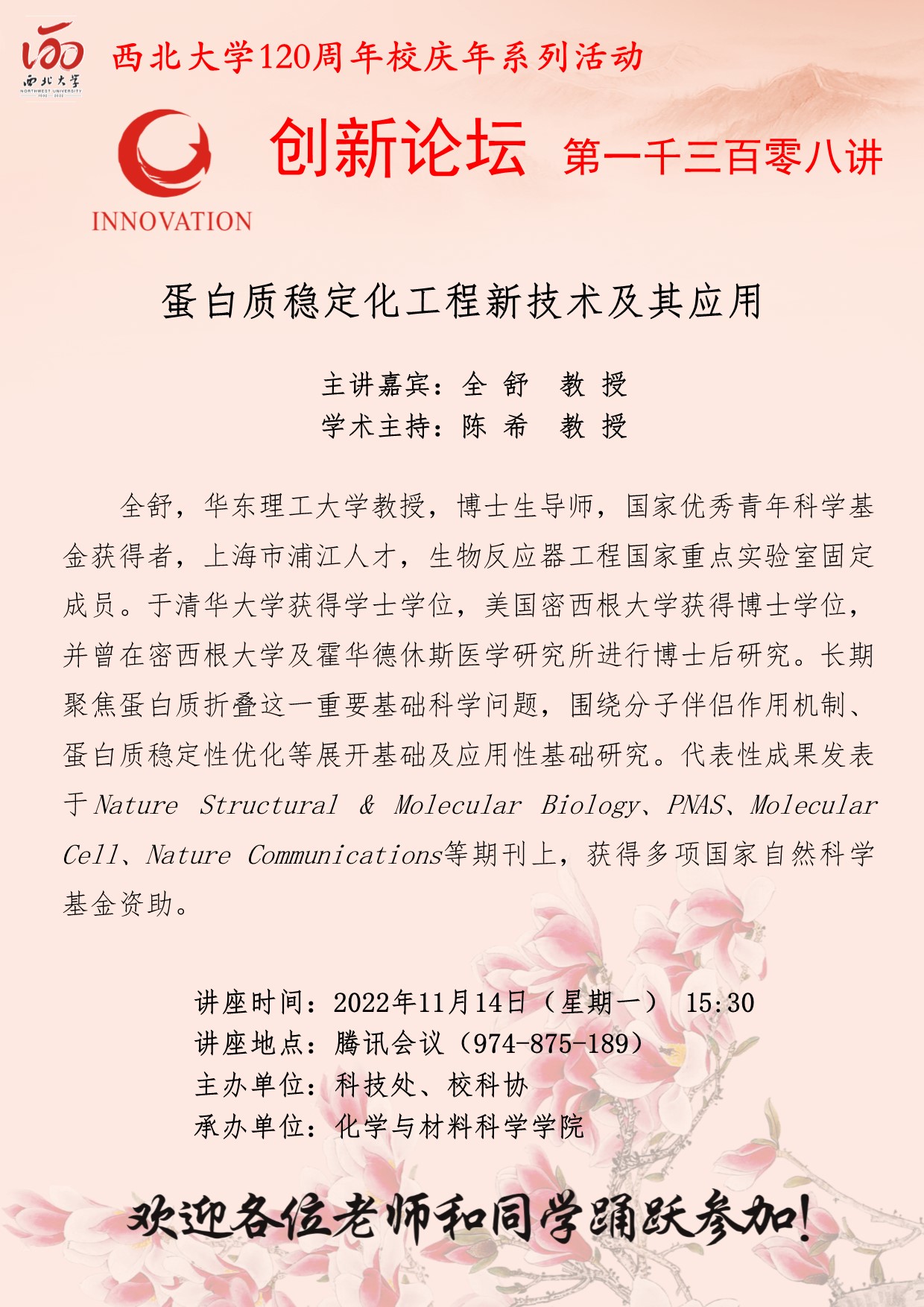 全舒 教授 开云手机网页版登录入口创新论坛第一千三百零八讲暨120周年校庆年系列活动: 蛋白质稳定化工程新技术及其应用 讲座时间 2022年11月14日(星期一)15:30 讲座地点 腾讯会议(974 875 189) 讲座人介绍 全舒 教授 讲座内容