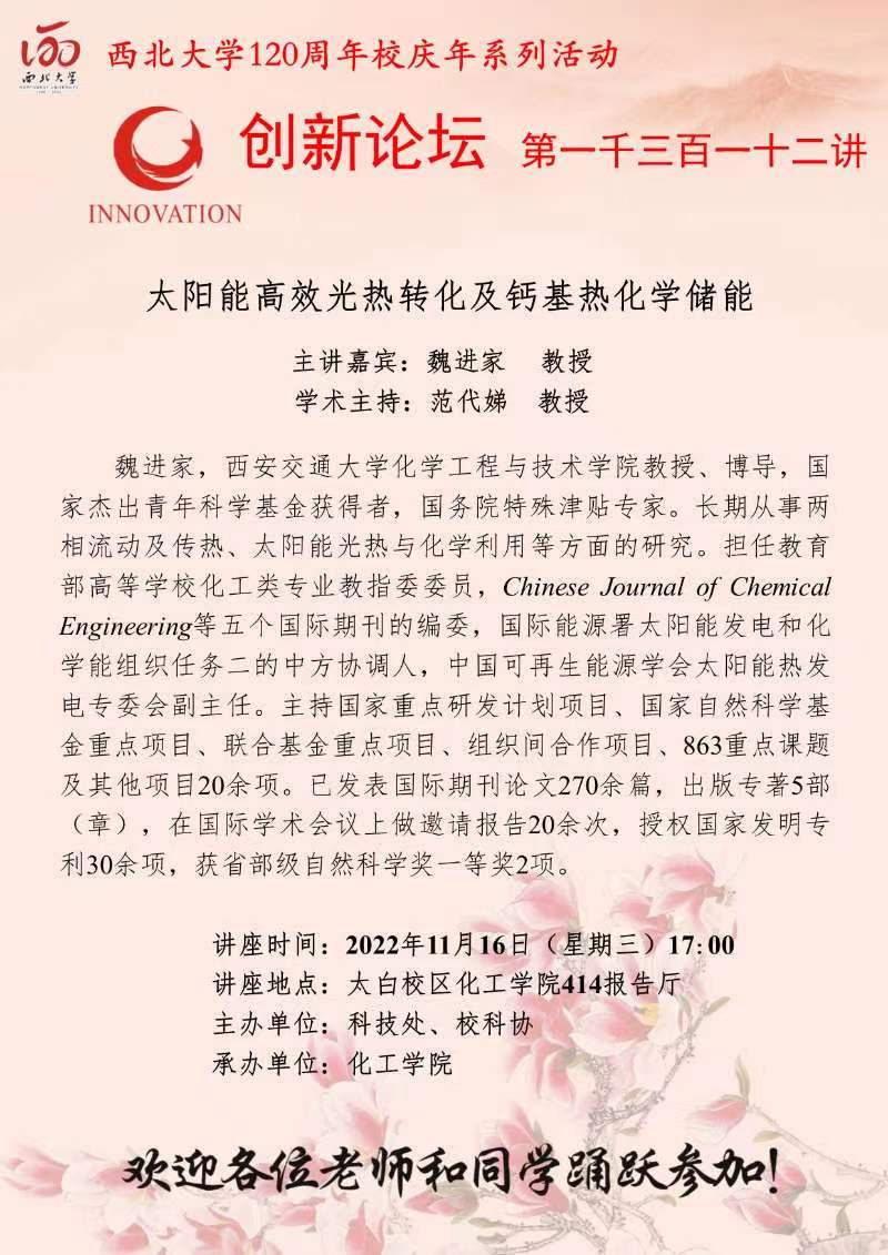 魏进家 教授 开云手机网页版登录入口创新论坛第一千三百一十二讲暨120周年校庆年系列活动:太阳能高效光热转化及钙基热化学储能 讲座时间 2022年11月16日(星期三)17:00 讲座地点 太白校区化工学院414报告厅 讲座人介绍 魏进家 教授 讲座内容