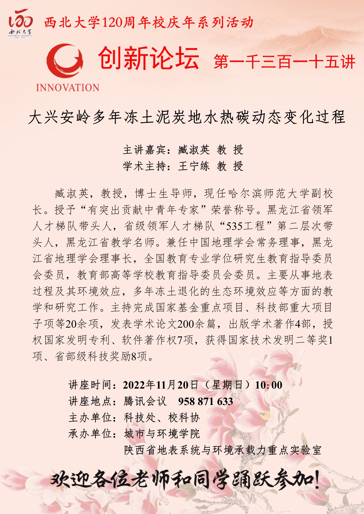 臧淑英 教授 开云手机网页版登录入口创新论坛第一千三百一十五讲暨120周年校庆年系列活动: 大兴安岭多年冻土泥炭地水热碳动态变化过程 讲座时间 2022年11月20日(星期日)10:00 讲座地点 腾讯会议 958 871 633 讲座人介绍 臧淑英 教授 讲座内容