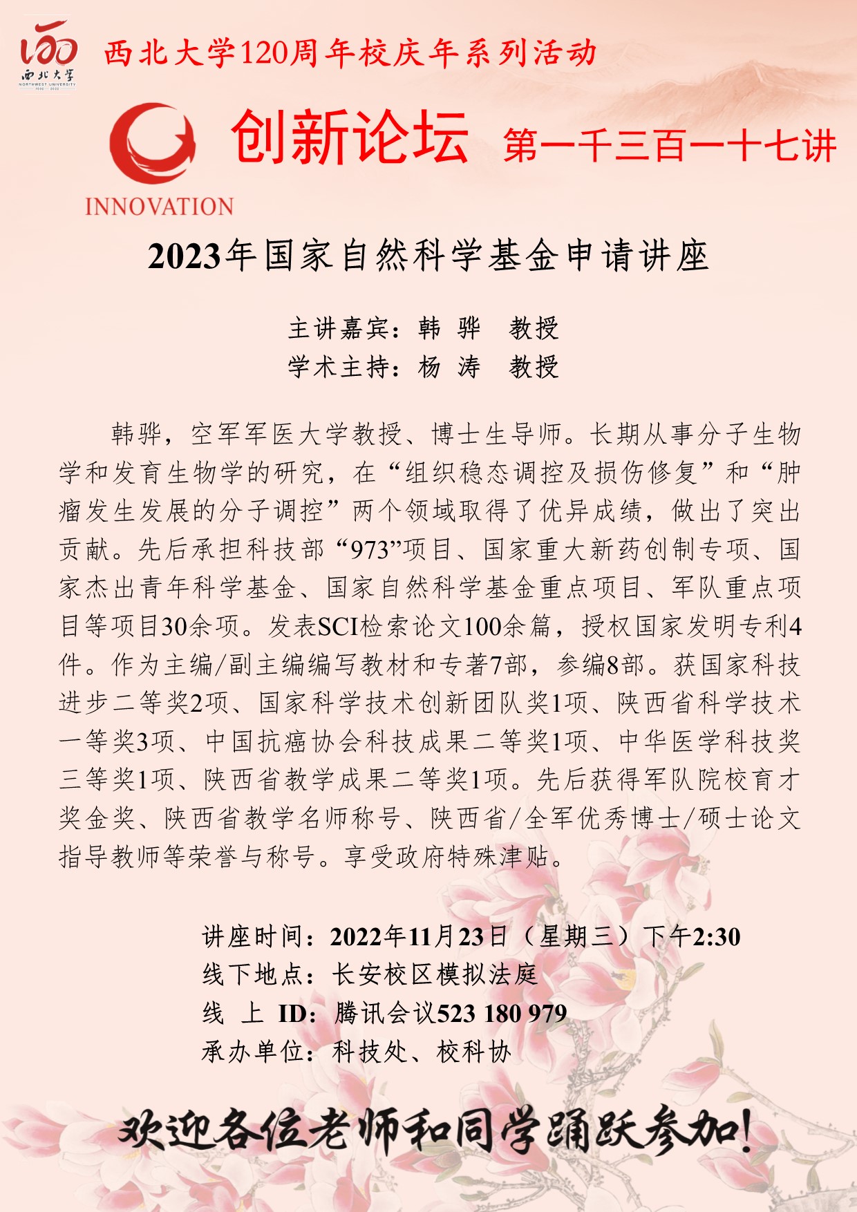 韩骅 教授 开云手机网页版登录入口创新论坛第一千三百一十七讲暨120周年校庆年系列活动:2023年国家自然科学基金申请讲座 讲座时间 2022年11月23日(星期三)下午2:30 讲座地点 长安校区模拟法庭 讲座人介绍 韩骅 教授 讲座内容